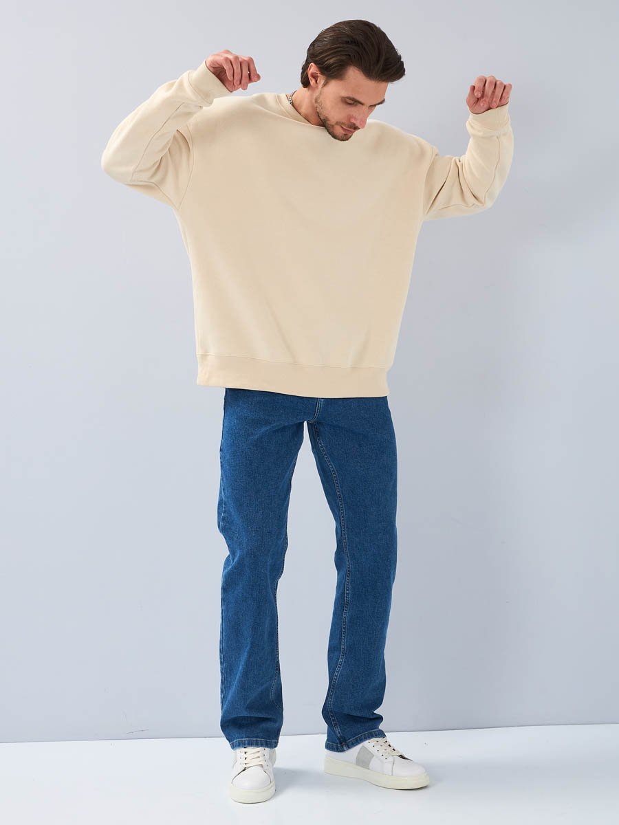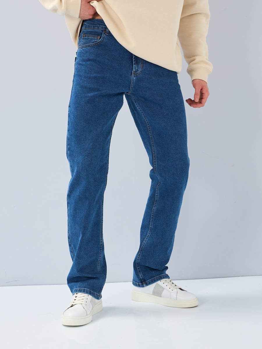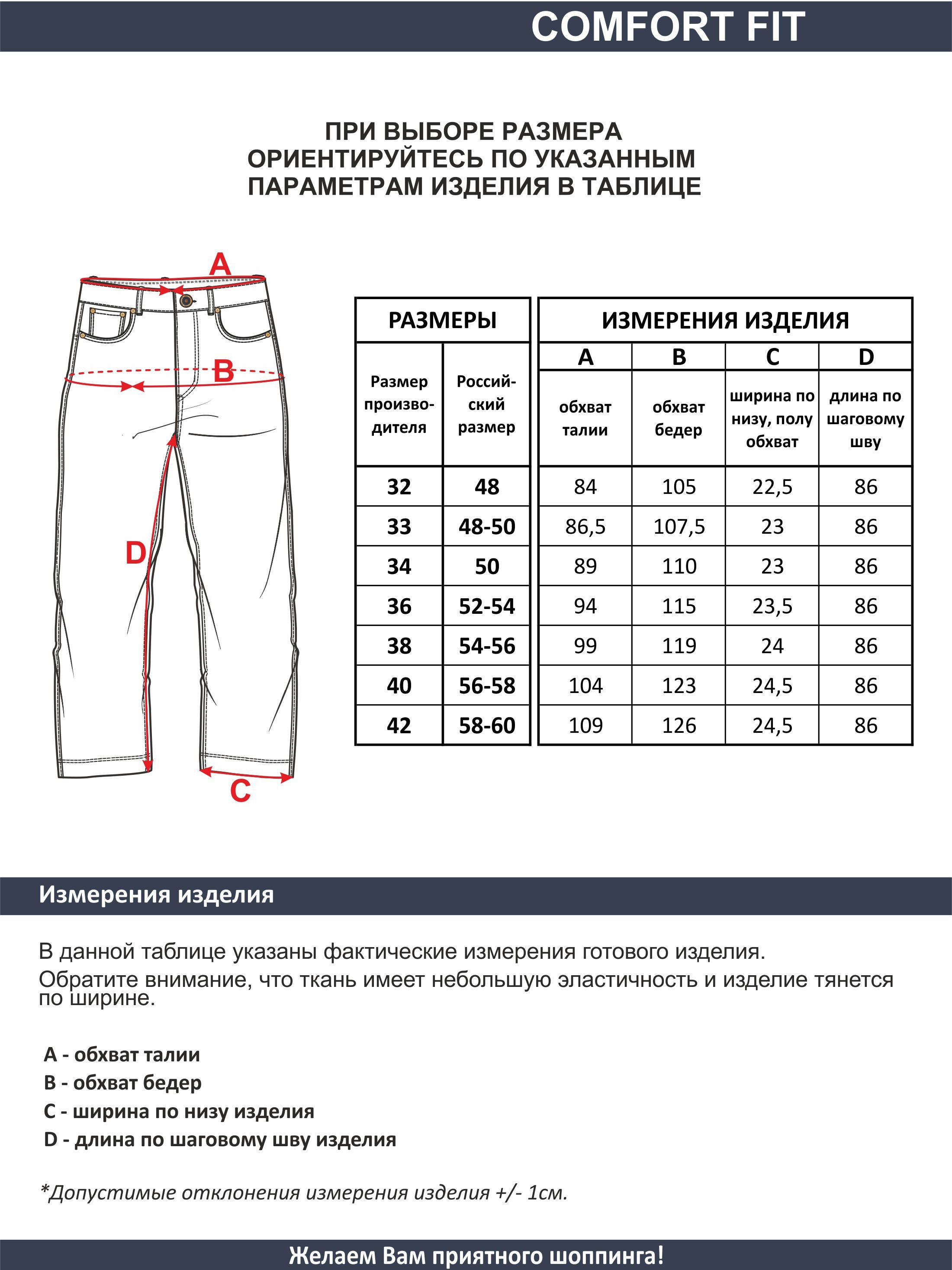 Мужские классические джинсы с пятью карманами. Посадка Comfort fit (свободные по бедру), высокая талия, широкие в колене и по низу. Застежка на молнии. Выполнены из слабоэластичной ткани denim comfort stretch. Средняя стирка темного оттенка с камнями (stone wash).