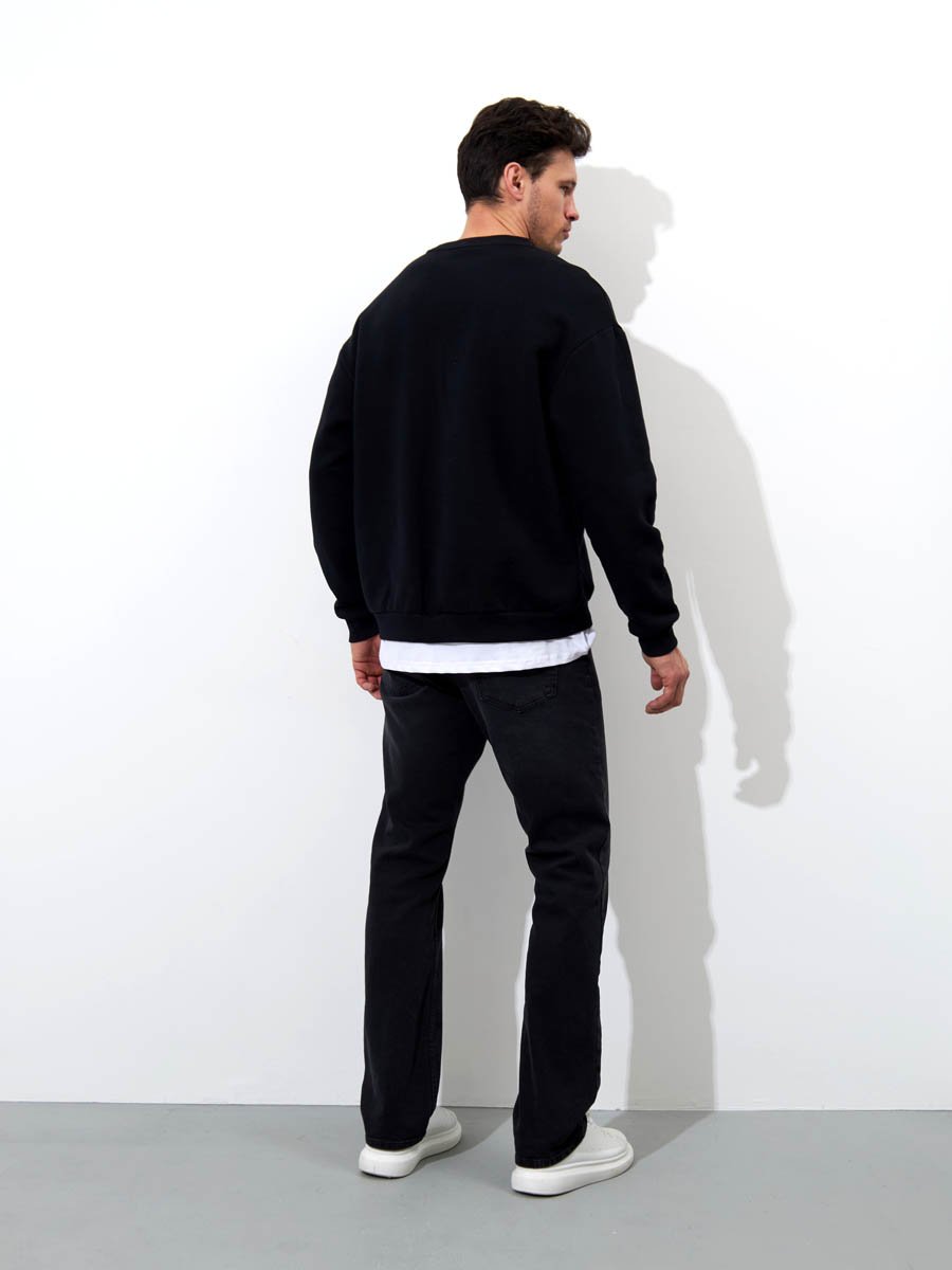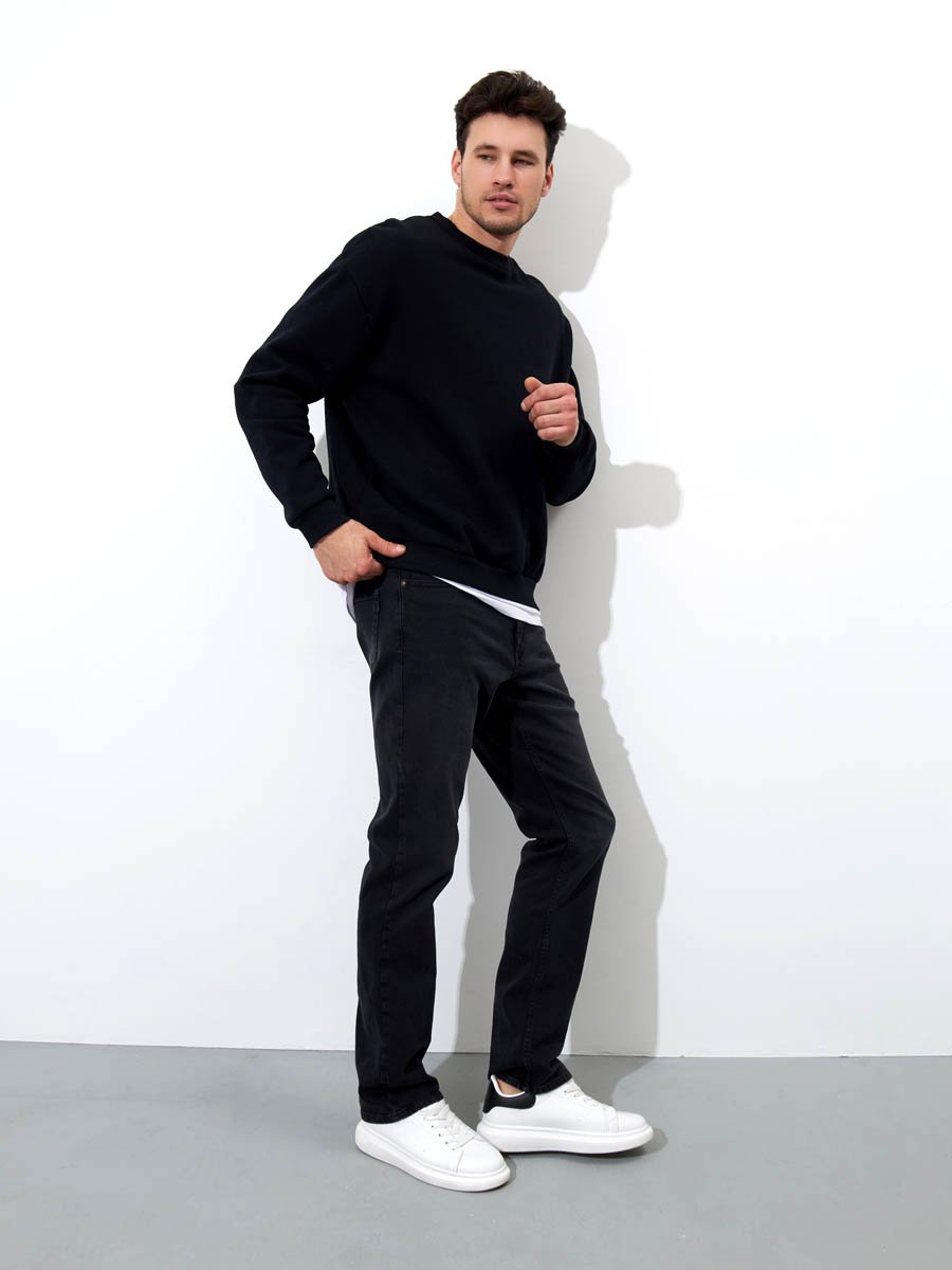 Мужские классические джинсы с пятью карманами. Посадка Regular fit (полуоблегающие по бедру), средняя высота талии. Застежка на молнии. Немного зауженные к низу. Выполнены из слабоэластичной ткани denim comfort stretch, цвет ткани  Black/Black (лицевая и изнаночная стороны ткани черные). Темная стирка со слабовыраженными потёртостями спереди и  сзади.