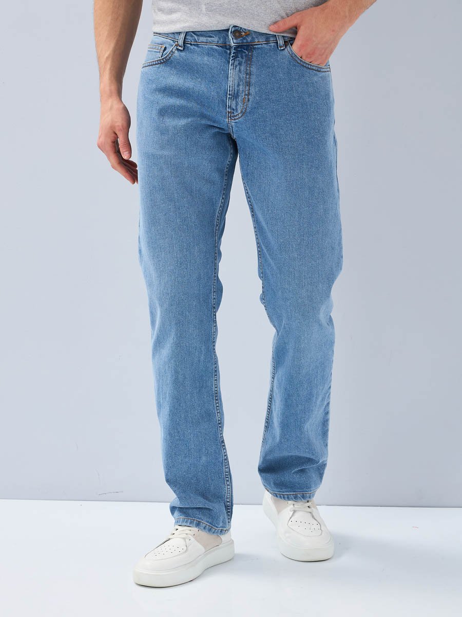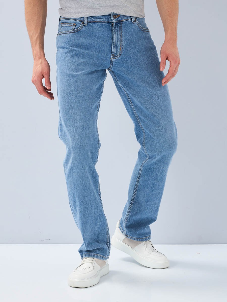 Мужские классические джинсы с пятью карманами. Посадка Regular fit (полуоблегающие по бедру), средняя высота талии. Застежка на молнии. Немного зауженные к низу. Выполнены из слабоэластичной ткани denim comfort stretch.  Средняя стирка со слабовыраженными  потёртостями спереди и  сзади.