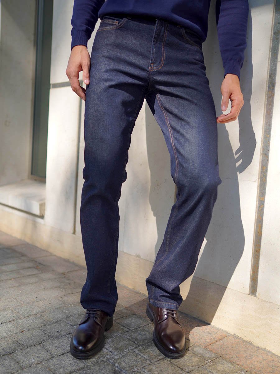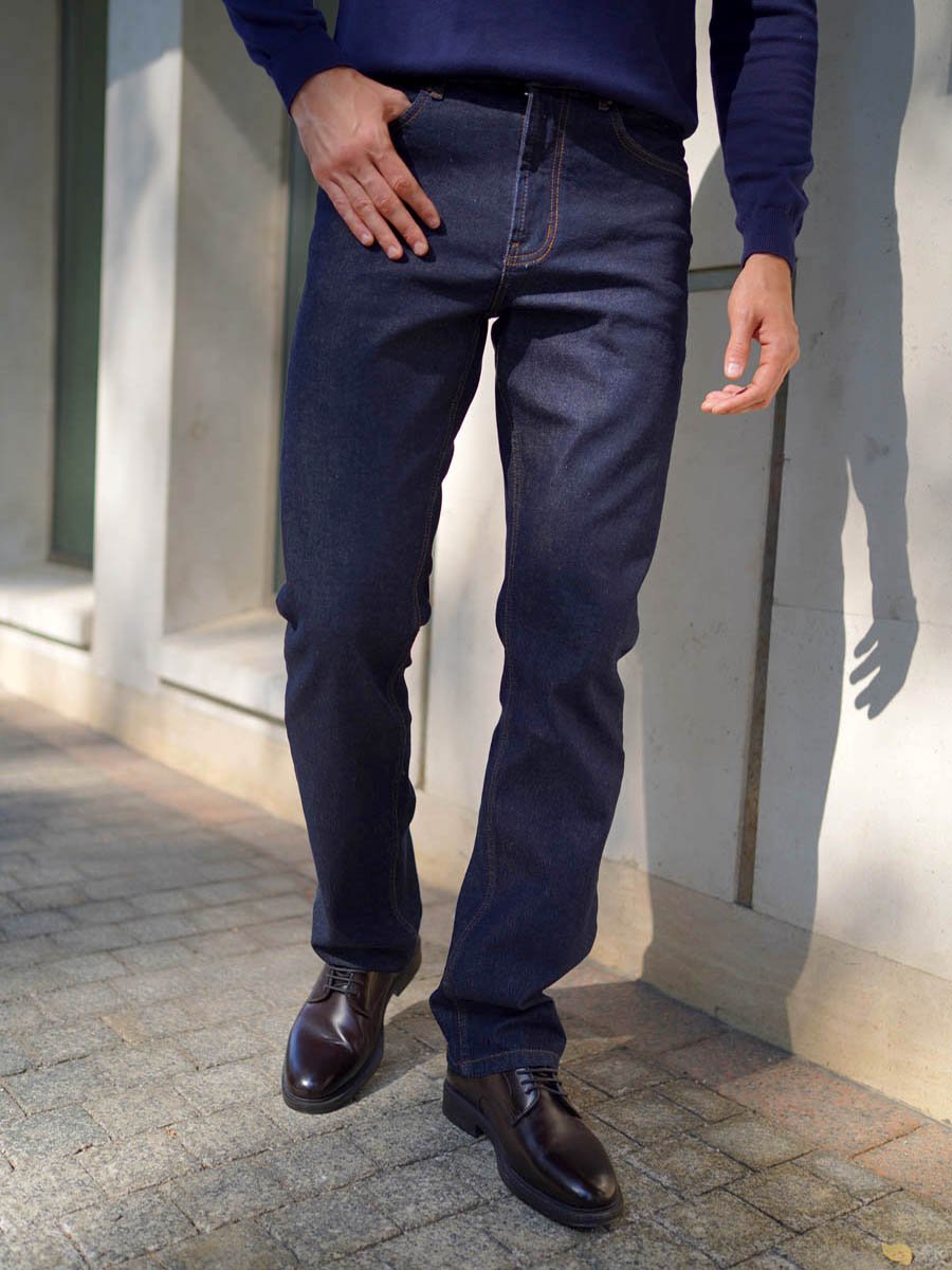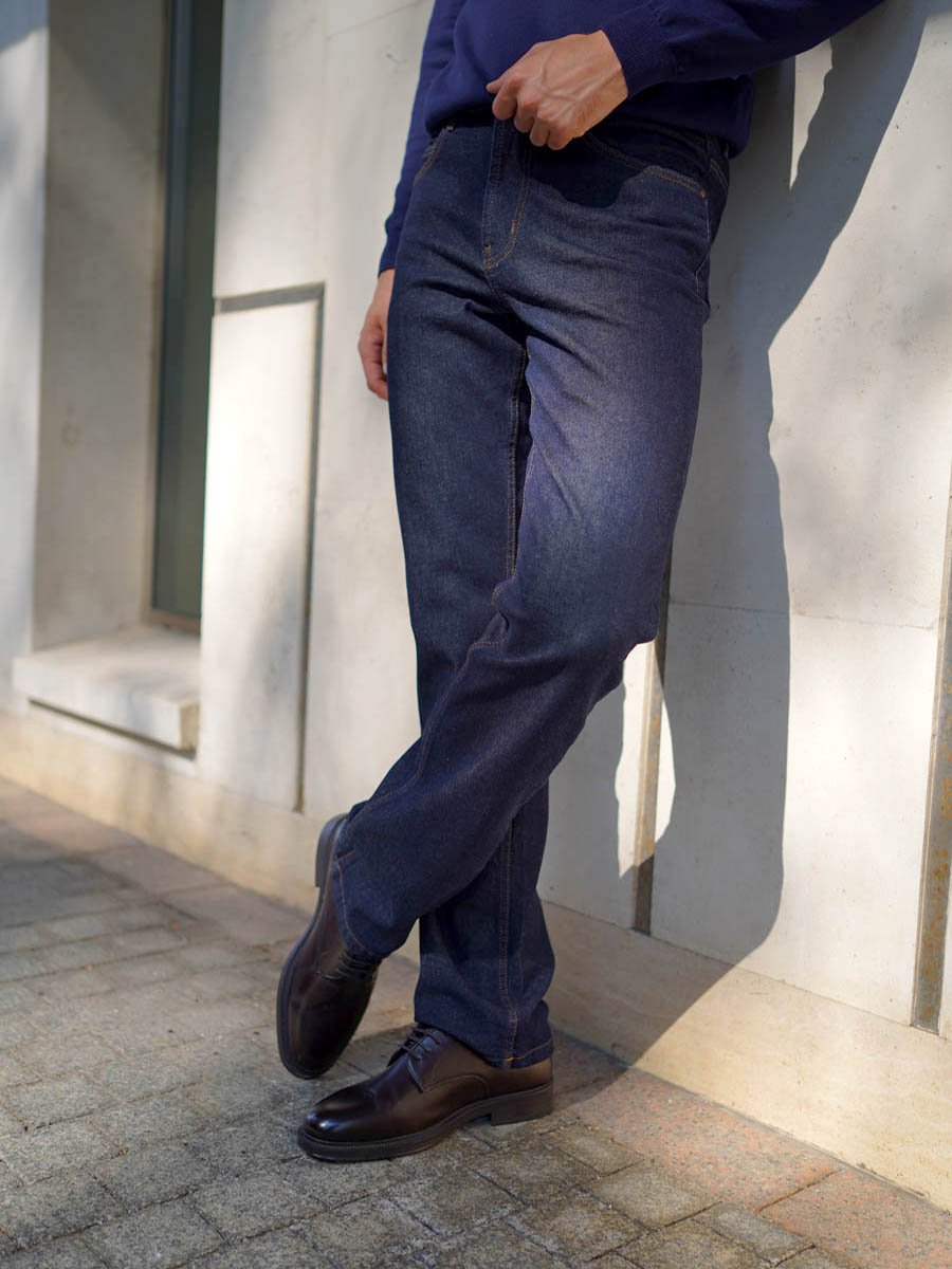 Мужские классические джинсы с пятью карманами. Посадка Regular fit (полуоблегающие по бедру), высокая талия, немного заужены к низу. Застежка на молнии. Выполнены из слабоэластичной ткани denim comfort stretch. Боковой шов сделан "в разутюжку", к нижней части шва  ришита  специальная декоративная тесьма  "selvadge", имитирующая контрастную кромку джинсовой ткани. Специальная стирка для сохранения  цвета не стираной ткани.