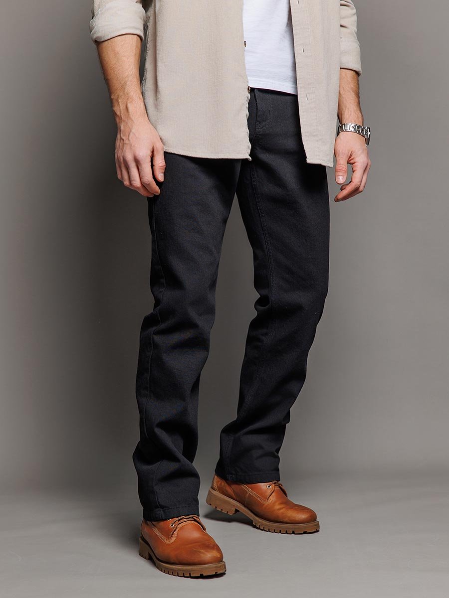 Мужские классические джинсы с пятью карманами. Посадка Regular fit (полуоблегающие по бедру), высокая талия. Застежка на молнии. Немного заужены в колене и по низу. Выполнены из традиционной хлопковой ткани denim, цвет ткани Black/Black (лицевая и изнаночная стороны ткани черные). Специальная темная стирка без потёртостей.