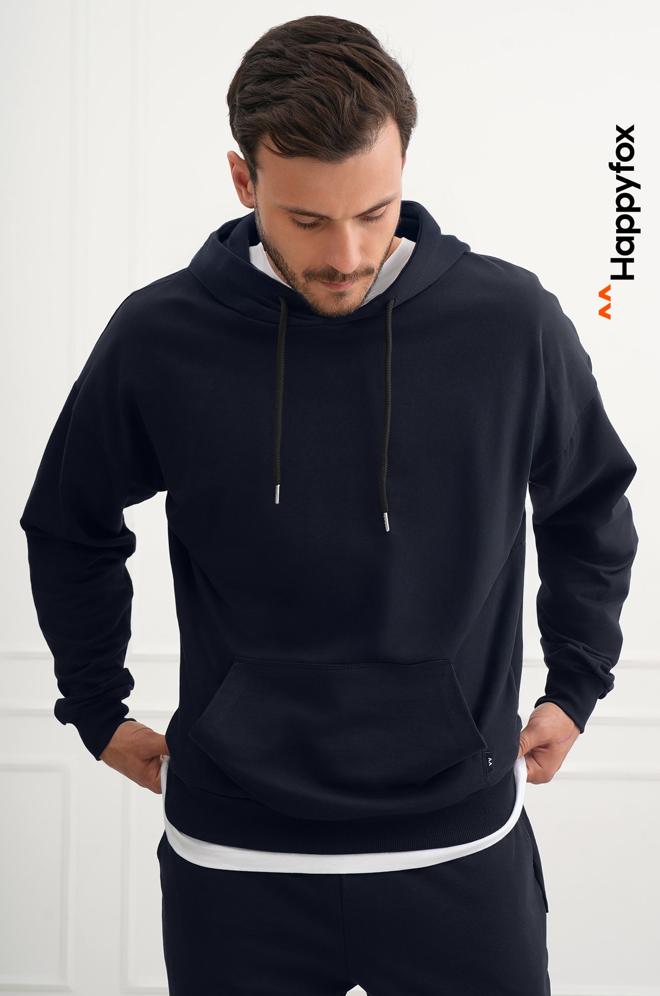 Мужской спортивный костюм из футера двухнитки — надежное решение для активного отдыха и туризма. Темно-синий костюм для мужчин сочетает комфорт, функциональность и стиль.