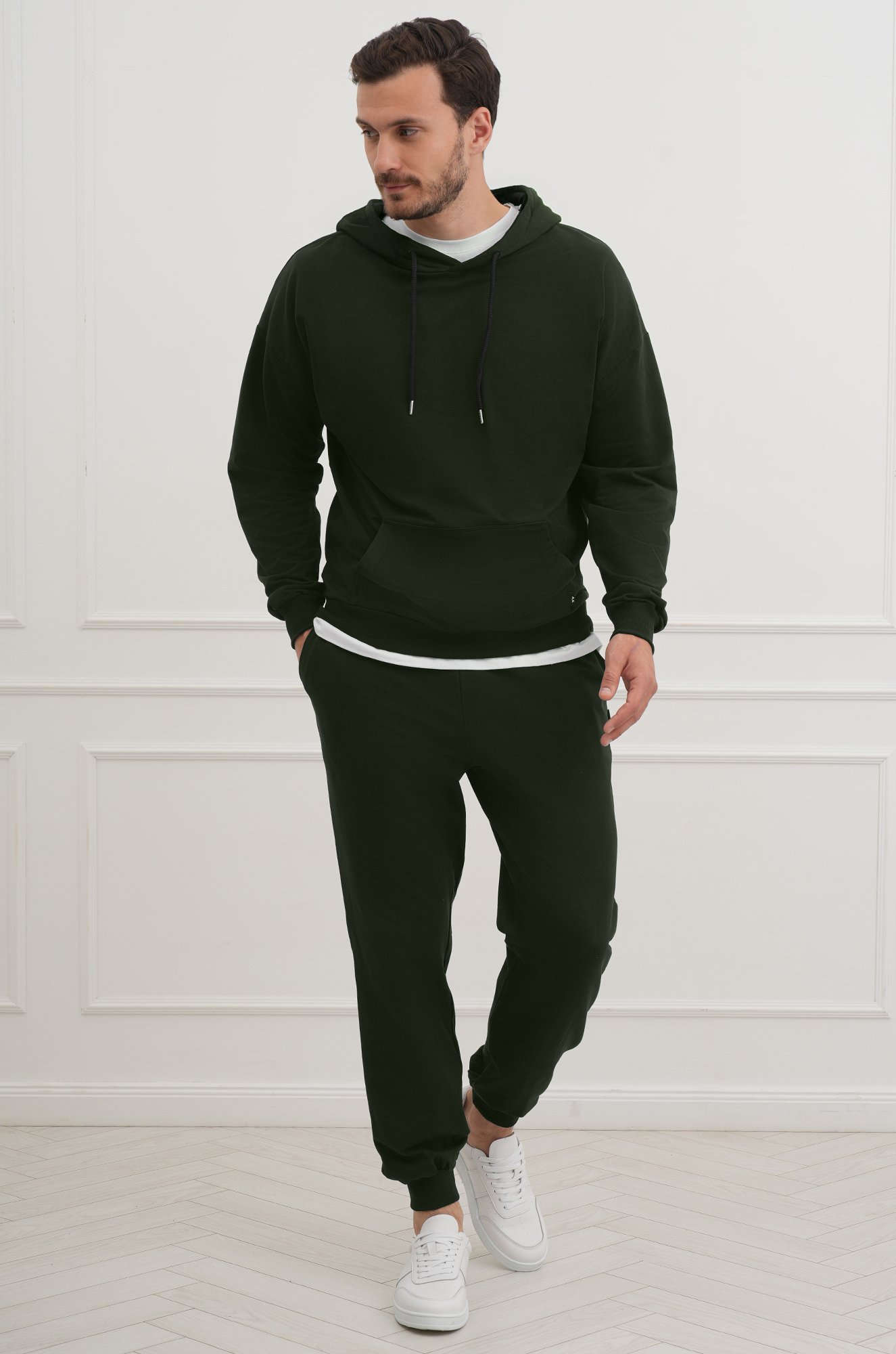 Мужской костюм защитного цвета хаки выполнен из качественного трикотажа футер двухнитка. Вдохновленный лаконичностью и функциональностью спортивный костюм идеален для тренировок и повседневной жизни.