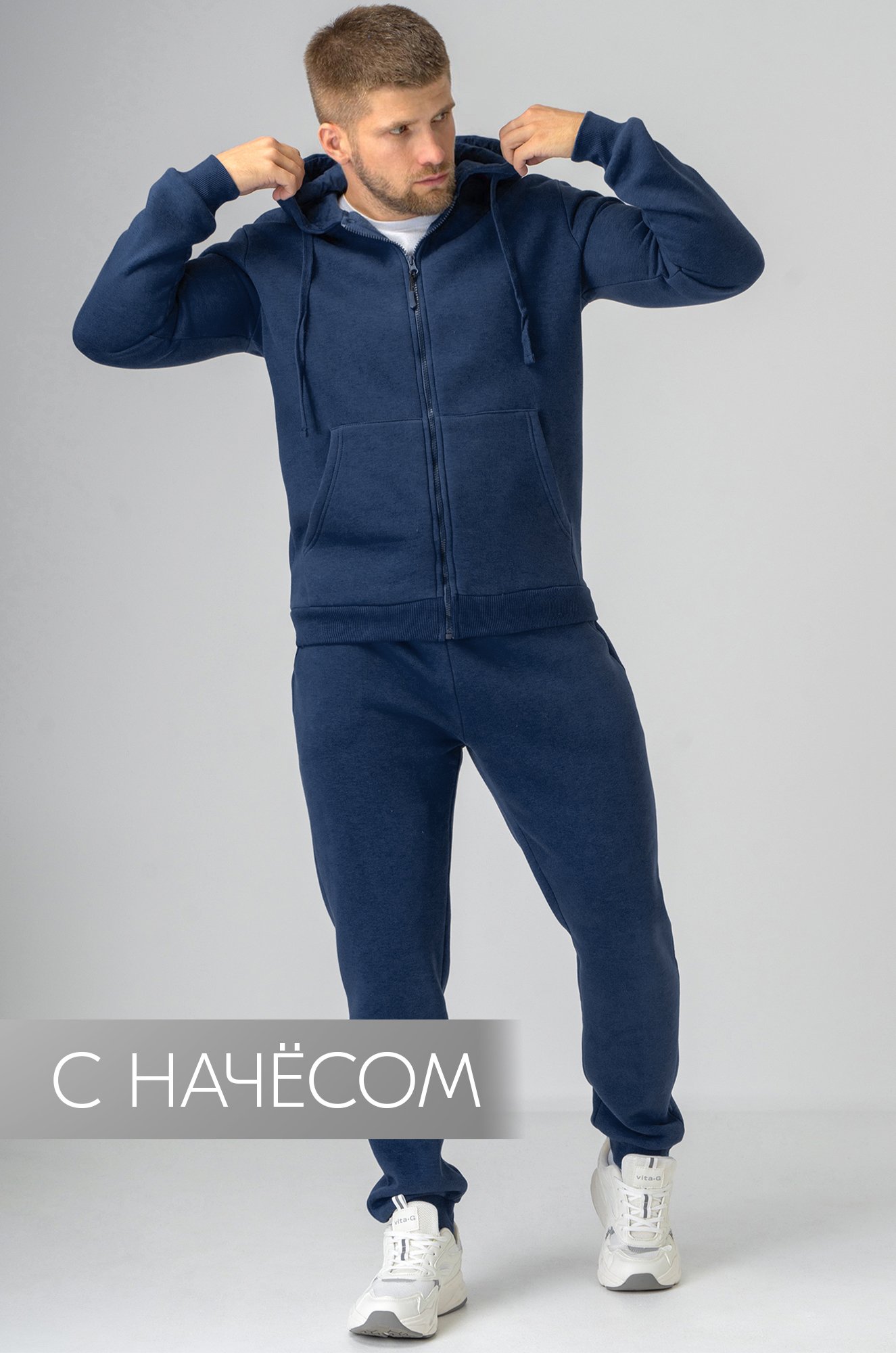 Теплый мужской костюм синего цвета от бренда Happyfox выполнен из трикотажа футер с начесом. В комплект входят толстовка с капюшоном и брюки-джоггеры, созданные для максимального комфорта и свободы движений.