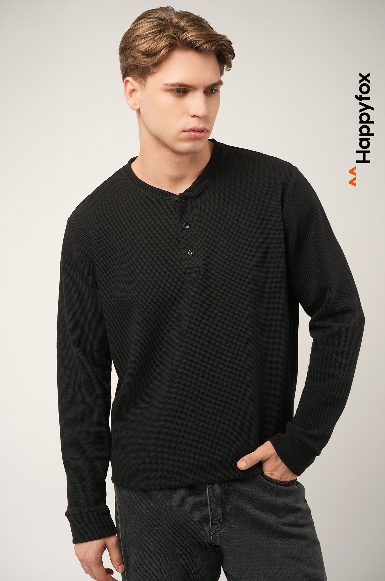 Трикотажный мужской лонгслив — твоя новая базовая классика! Стильная модель с оригинальным вырезом хенли легко заменит рубашку поло с длинным рукавом. Однотонный черный цвет и универсальный крой делают лонг идеальным для офиса и повседневных образов.