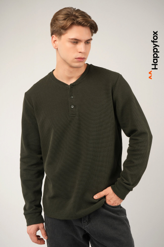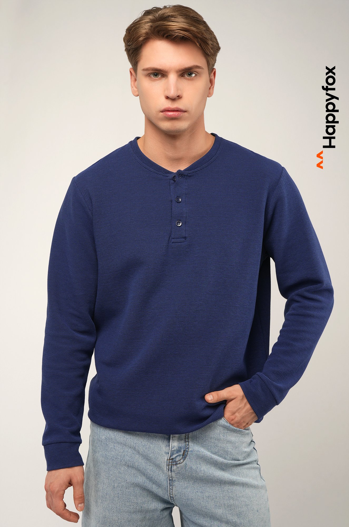 Трикотажный мужской лонгслив — твоя новая базовая классика! Стильная модель с оригинальным вырезом хенли легко заменит рубашку поло с длинным рукавом. Однотонный синий цвет и универсальный крой делают лонг идеальным для офиса и повседневных образов.