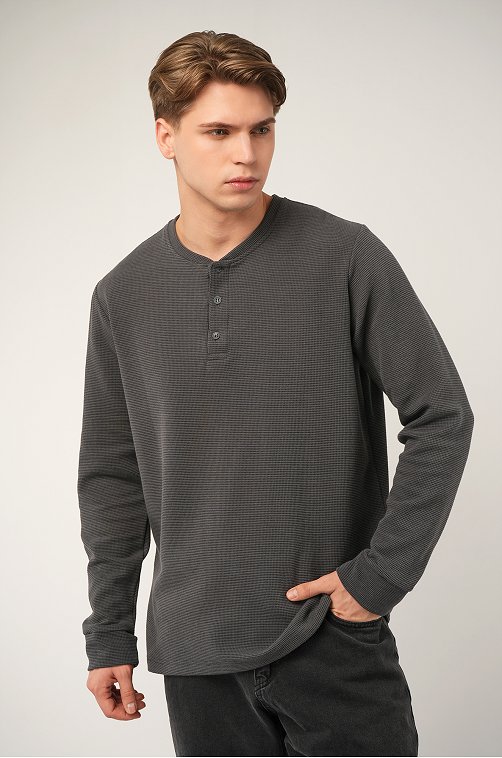 Трикотажный мужской лонгслив — твоя новая базовая классика! Стильная модель с оригинальным вырезом хенли легко заменит рубашку поло с длинным рукавом. Однотонный графитовый цвет и универсальный крой делают лонг идеальным для офиса и повседневных образов.