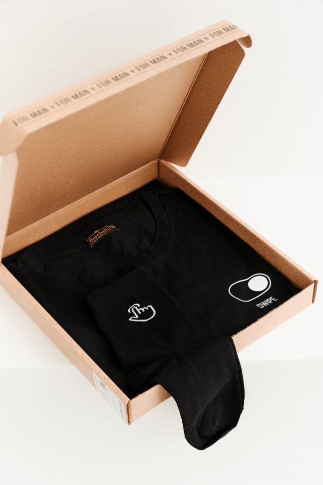 Подарочный набор "СВАЙП". Черная мужская футболка с принтом и носки с принтом подчеркнут вкус и чувство юмора. Подарочный набор упакован в крафтовую коробку с тематическим принтом. Футболка из 100% хлопка подойдет для повседневной носки и для выхода из дома. Мужская футболка подойдет для занятий спортом и для активных прогулок. Футболка будет отлично сидеть практически на любой фигуре. Носки подойдут к любой одежде и обуви. Изготовлены из высококачественного хлопка, который отлично впитывает влагу, пропускает воздух и подходит даже для самой чувствительной кожи. Хорошо сохраняют форму и цвет, устойчивы к истиранию. Подарочный набор "СВАЙП" будет отличным подарком второй половинке, близкому другу, отцу и дедушке. Размер носков 40-47. Рост модели на фото 183 см, размер 52.