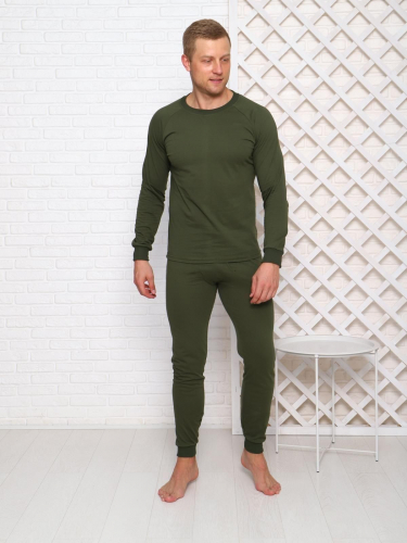 Пижама изготовлена из хлопкового трикотажа. Хлопковый трикотаж комфортен и гигиеничен, позволяет коже дышать. В комплект входит трикотажный лонгслив и кальсоны. Лонгслив имеет круглую горловину, манжеты на рукавах. Брюки на резинке, нижние края брюк имеют трикотажные манжеты. Пижама не сковывает движений, при этом дает дополнительный терморегулирующий слой одежды.