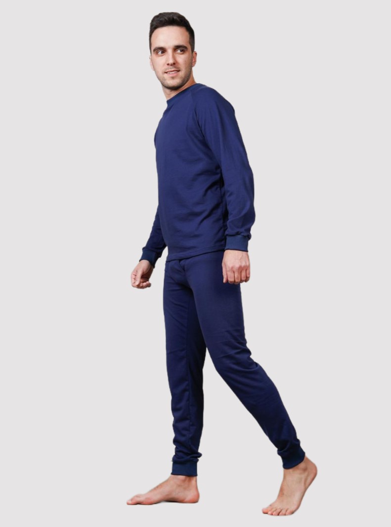 Пижама изготовлена из хлопкового трикотажа. Хлопковый трикотаж комфортен и гигиеничен, позволяет коже дышать. В комплект входит трикотажный лонгслив и кальсоны. Лонгслив имеет круглую горловину, манжеты на рукавах. Брюки на резинке, нижние края брюк имеют трикотажные манжеты. Пижама не сковывает движений, при этом дает дополнительный терморегулирующий слой одежды.
