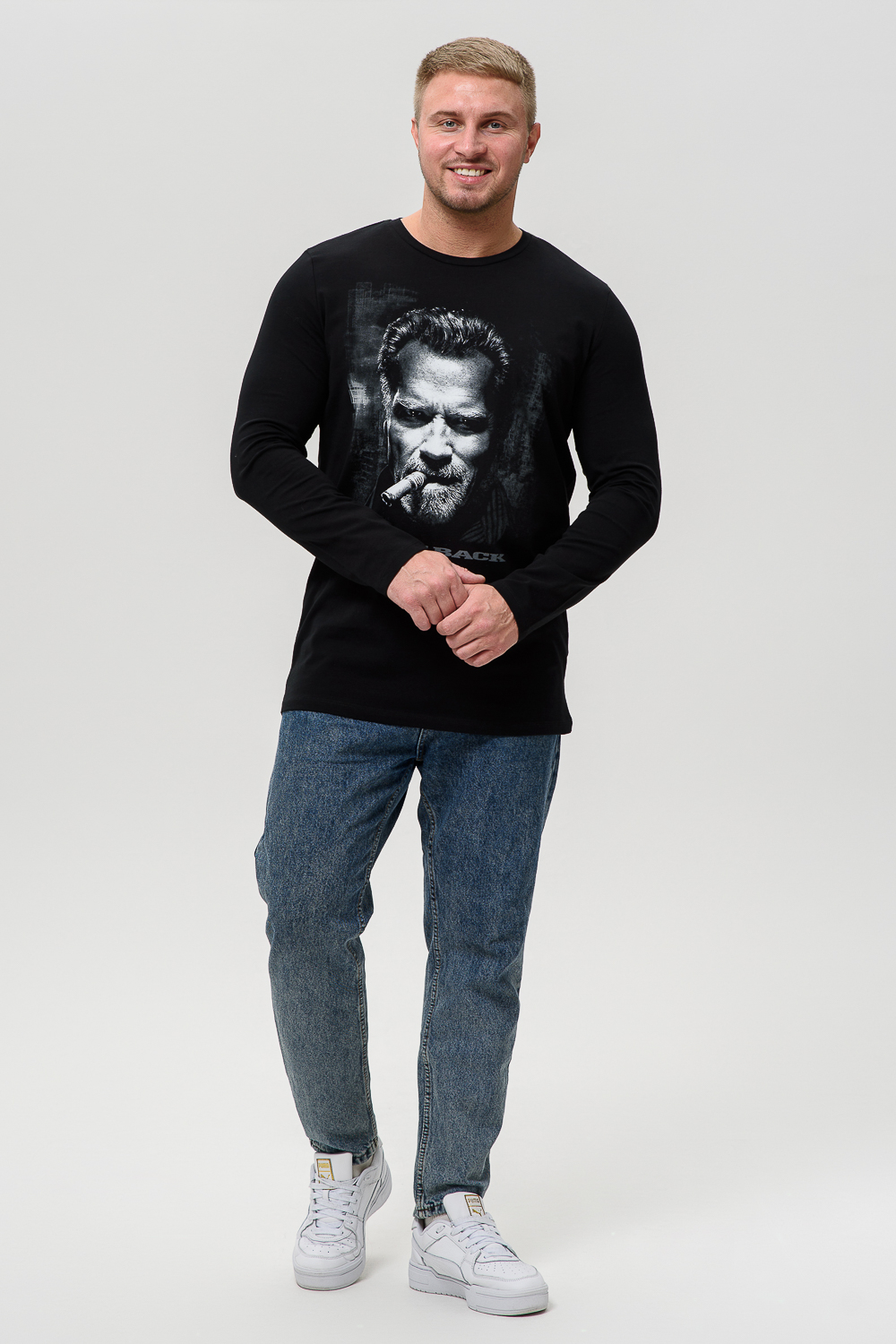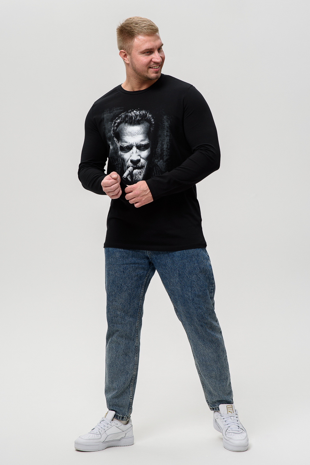 Лонгслив снова в моде и прочно обосновался в базовом гардеробе современного человека. Удобная трикотажная кофта представляет собой футболку с длинным рукавом, которую можно использовать как самостоятельный элемент, так и носить под пиджак, толстовку или рубашку. Лонгслив выполнен из высокоплотного хлопкового трикотажа и является невероятно комфортным и удобным. Футболка с длинными рукавами имеет прямой базовый крой и классическую линию плеча. Лонгслив - это неформальный стиль, когда на футболку можно надеть клетчатую рубашку и сочетать с кедами и джинсами. За счет натуральной ткани лонгслив можно носить в качестве домашней одежды или нательного белья, одежды для сна, тренировочной спортивной одежды и военной экипировки. Если вы хотите силуэт оверсайз нужно взять на размер или два больше, ориентируйтесь по таблице замеров. Цвет: черный+Шварценеггер; Материал: кулирка с лайкрой;кулирка с лайкрой; Состав: 92% хлопок, 8% эластан.