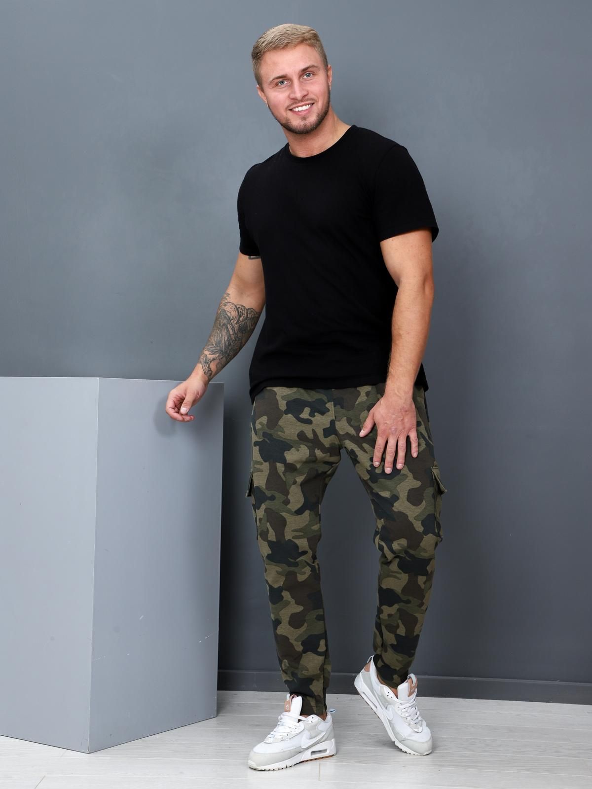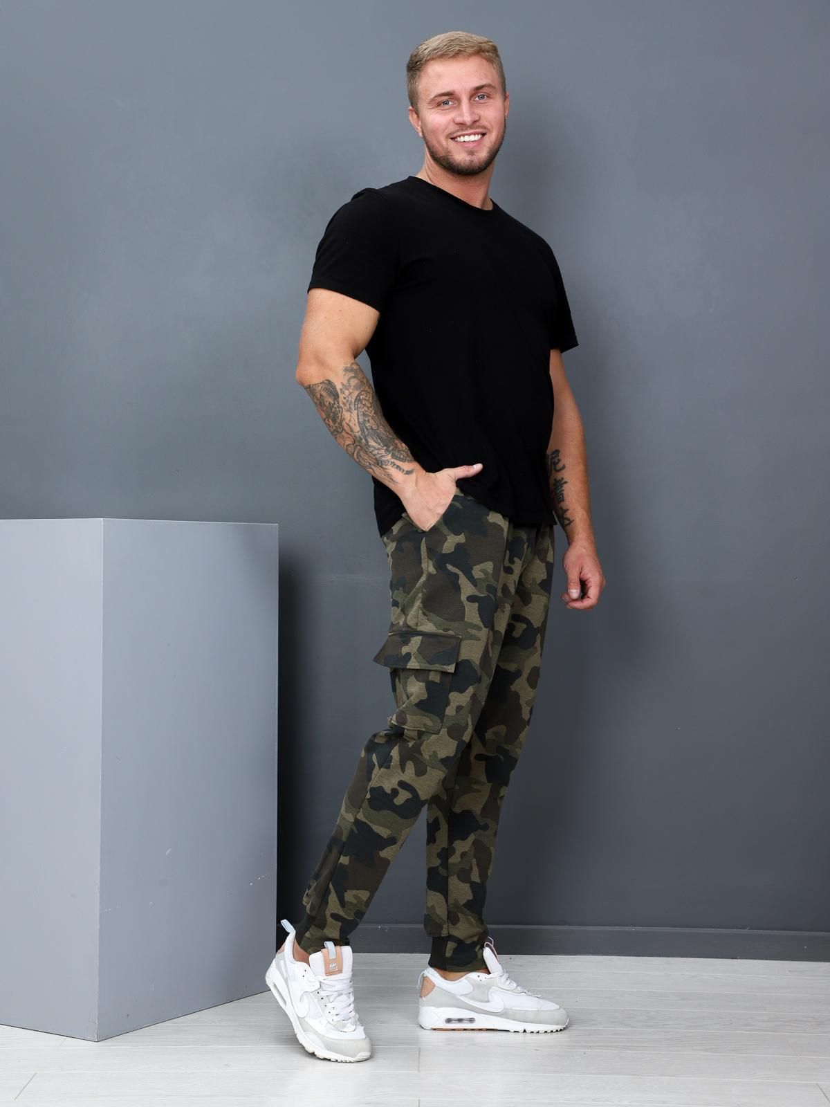 Мужские брюки выполнены из футера двунитки (с лайкрой) популярной расцветки "камуфляж". Прямой крой,  карманы, пояс на эластичной тесьме, шнуровка- что еще нужно для комфорта?. Брюки прекрасно подойдут для дома, отдыха и занятий спортом. Универсальная базовая модель на каждый день.