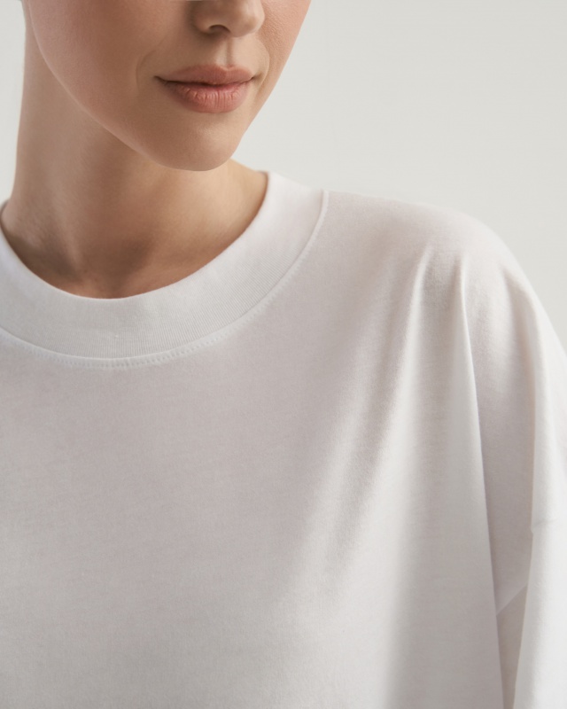 Футболка свободного силуэта. Спущенное плечо. Горловина из двух деталей, из рибаны. Состав: ХЛОПОК 100%