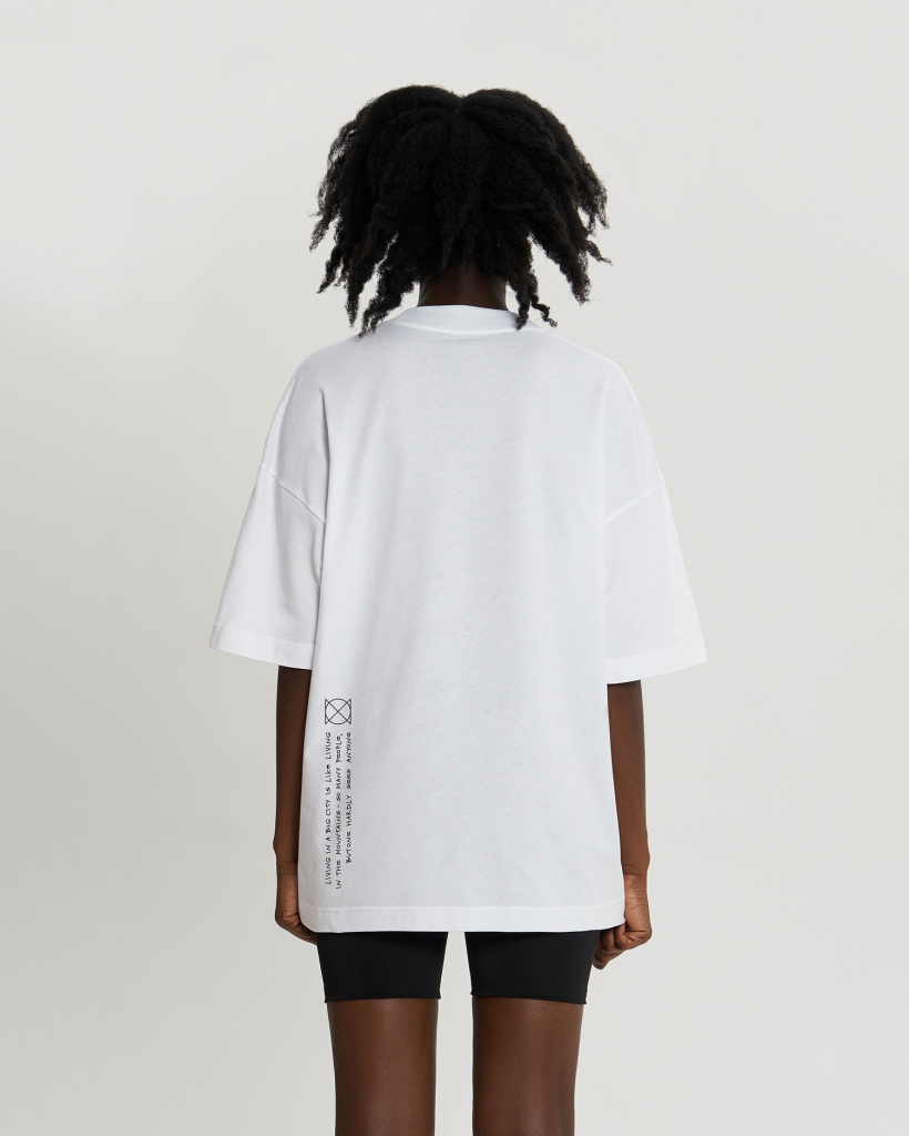 Футболка свободного силуэта. Спущенное плечо. Горловина из двух деталей, из рибаны. Укрепление бейкой плечевых швов и горловины спинки. Состав: ХЛОПОК 100%