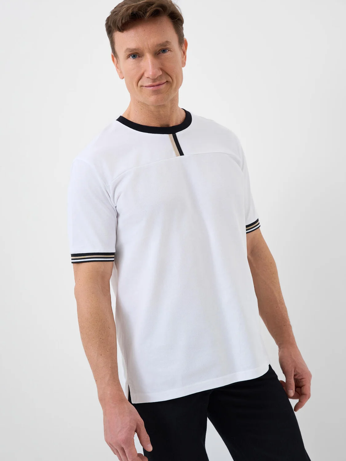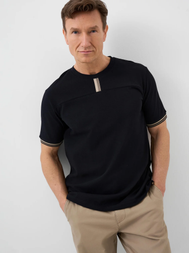 Мужская футболка. Модель прямого кроя, выполнена из эластичного хлопкового трикотажа пике. Горловина круглая, обработана эластичным рибом. Разрезы по бокам.