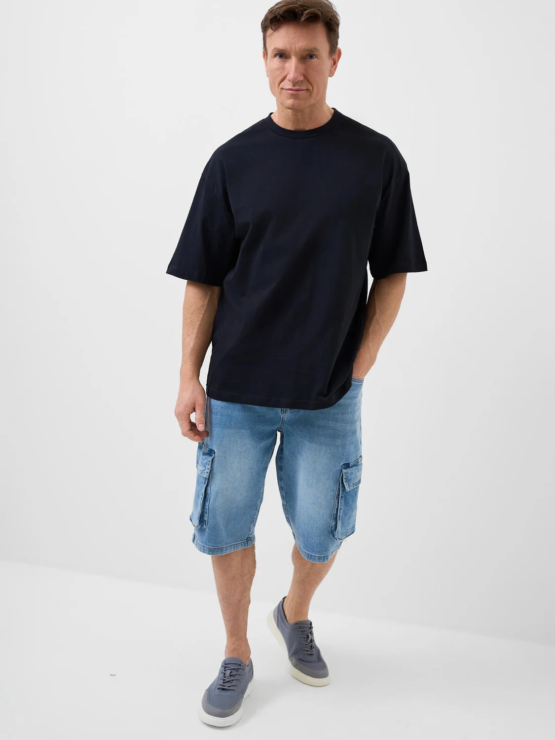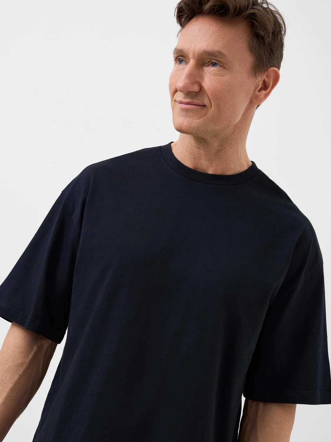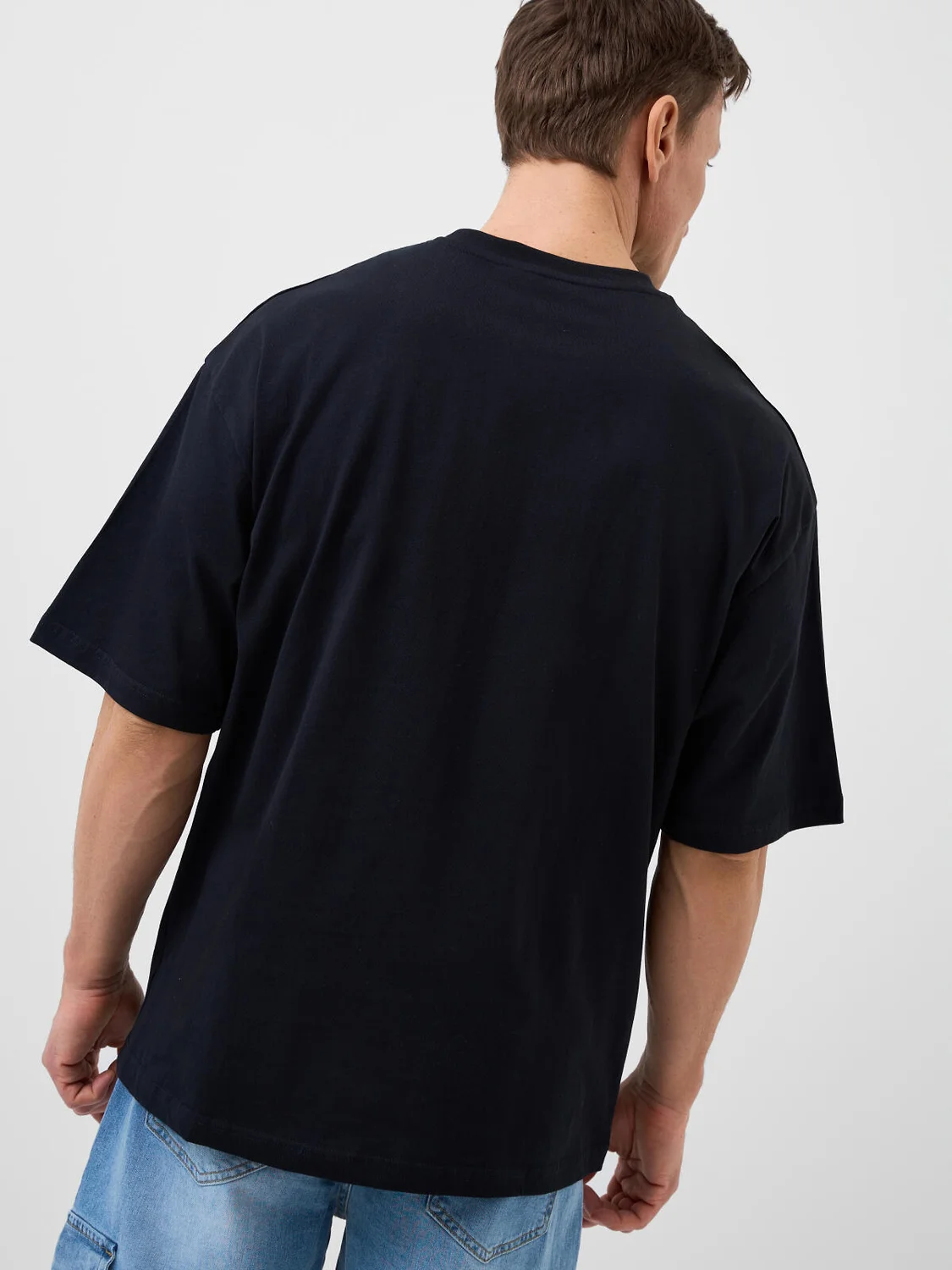 Мужская базовая футболка оверсайз. Модель выполнена из эластичного хлопкового трикотажа джерси. Горловина обработана эластичным рибом.