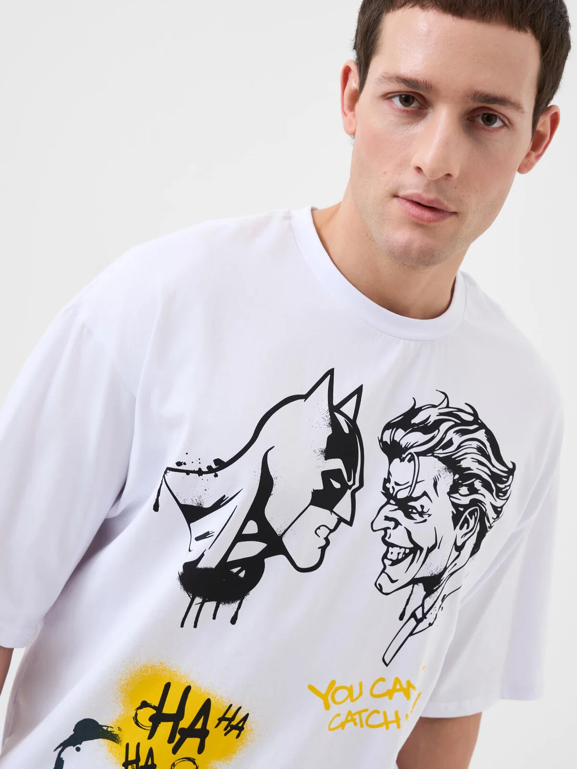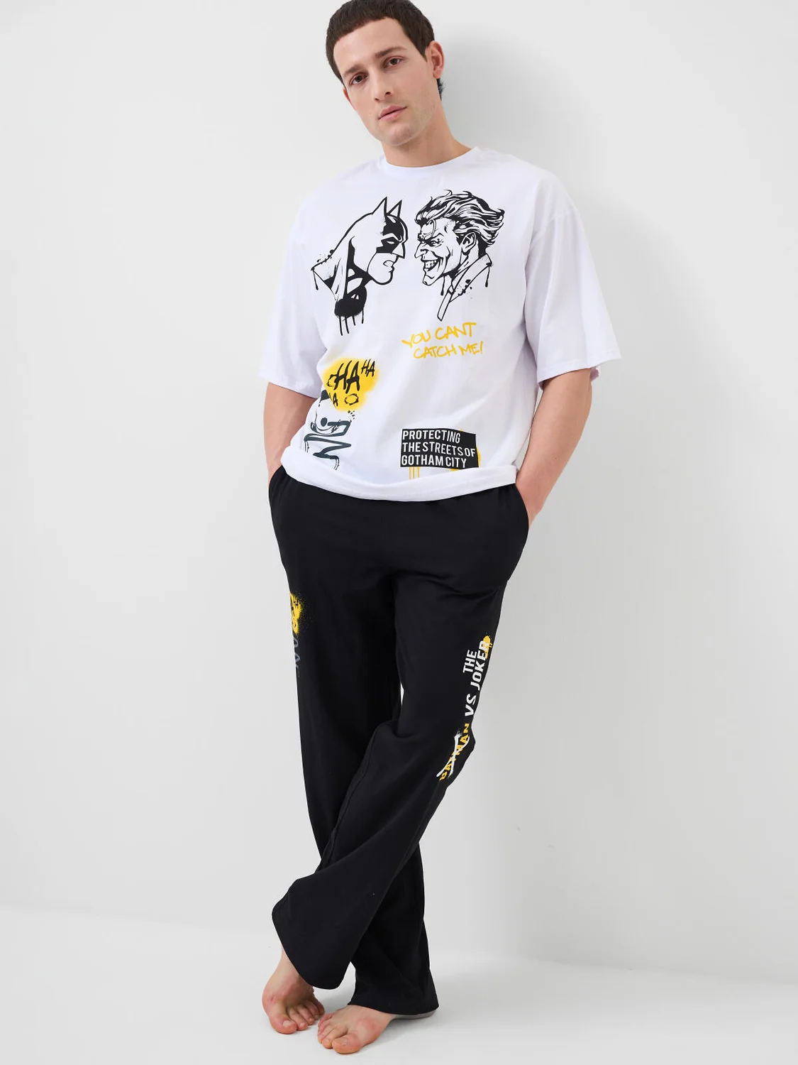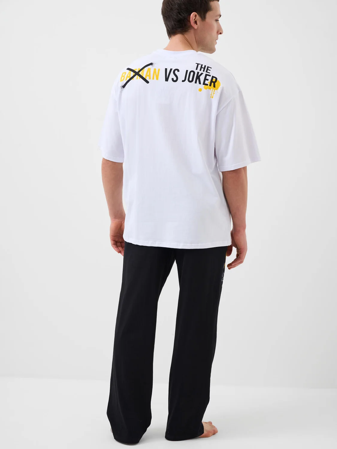 Мужская пижама. Комплект состоит из белой оверсайз футболки с коротким рукавом и чёрных брюк. На футболке изображены персонажи Бэтмен и Джокер в стиле граффити. Брюки на широкой резинке со шнурком для регулировки, с боковыми карманами. Материал - мягкий, хлопковый трикотаж. Можно составить family look c детским вариантом пижамы аналогичного дизайна.