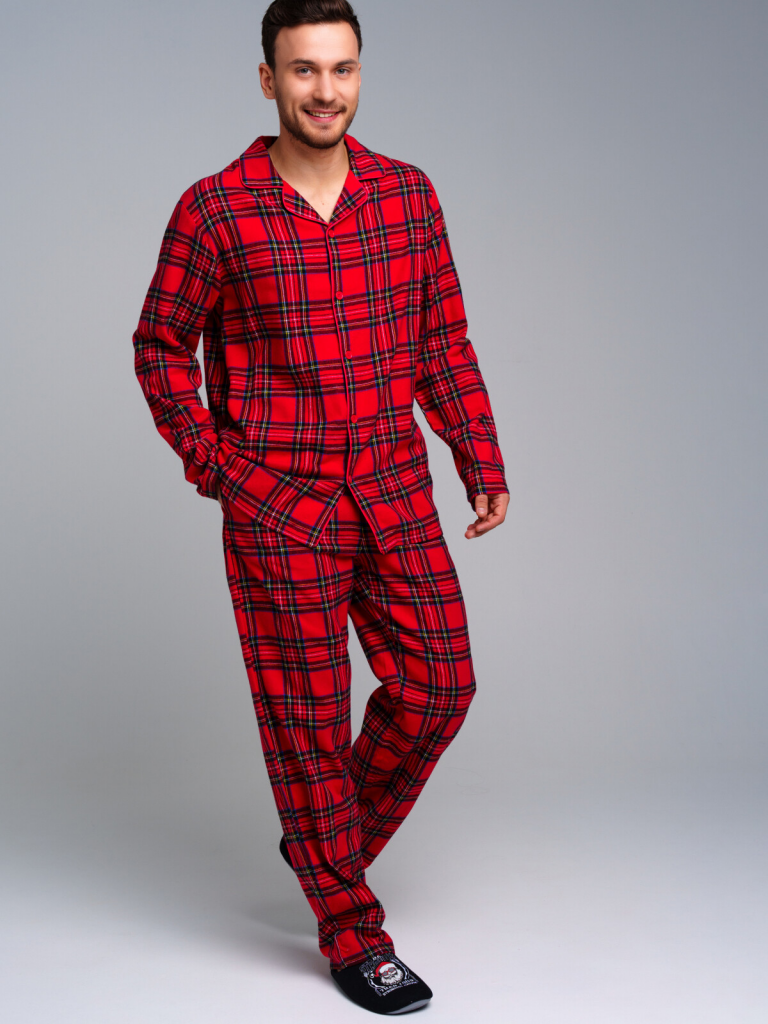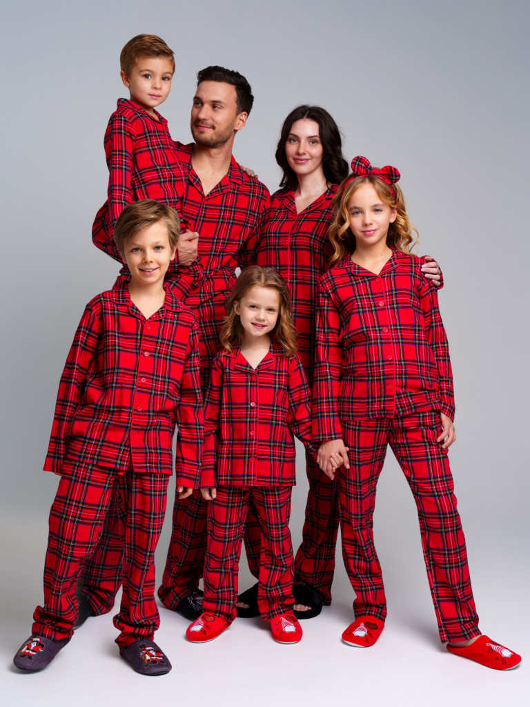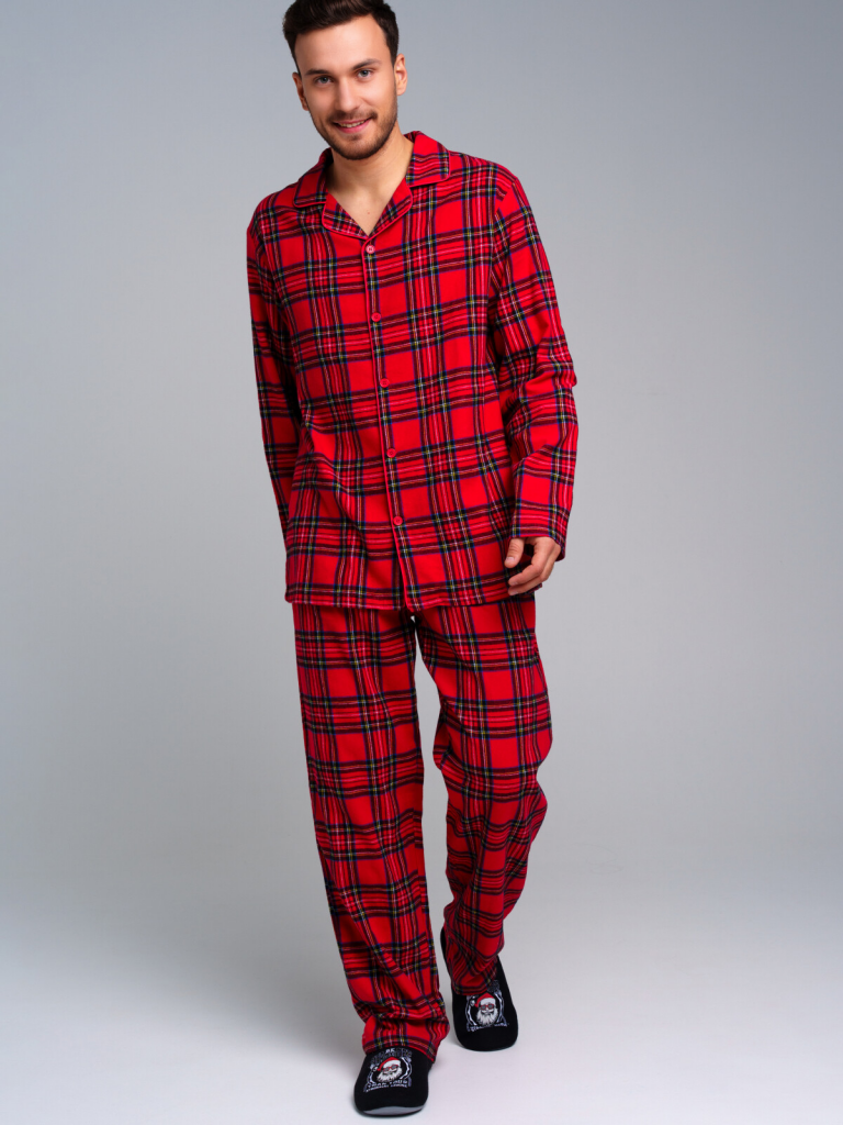 Пижама текстильная взрослых размеров: можно составить family look c детским вариантом пижамы аналогичного дизайна. 100% хлопок. Фланель - мягкая, приятная к телу ткань с небольшим начесом. Застежка на пуговицы. Карманы в брюках. Эластичный пояс с тесьмой позволяет легко надевать брюки и утягивать до комфортной посадки.