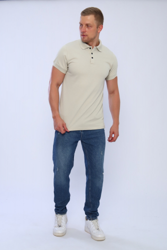 Поло мужское из кулирки с лайкрой 92% хлопок 8 % лайкра. Поло с рубашечным воротником, планка на пуговицы, на спинке кокетка, отделочные детали и кант на плечах и кокетке из темно-синего трикотажа. Футболка отлично подойдет для дома и отдыха.