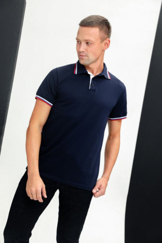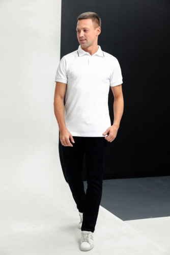 Футболка-поло мужская выполнена из ткани пике качества пенье 95% хлопок 5% лайкра. На поло вязаные воротник и манжеты в цвет ткани с трехцветными контрастными полосками триколор по краю, планка контрастного белого цвета на 3 пуговицах, по бокам разрезы. Футболка удобная, комфортная, идеально подойдет как для дома, так и для прогулок и отдыха.