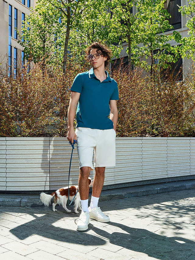 Мужское поло прилегающего силуэта из трикотажного пике — это удачное сочетание классики и современного стиля. Контрастный отложной воротник и круглая горловина с застежкой на пуговицы придают модели элегантный акцент, а короткие рукава и декоративные разрезы в боковых швах обеспечивают свободу движений и визуальную легкость. Трикотаж пике отличается характерной текстурой, хорошо пропускает воздух и сохраняет форму, что делает изделие комфортным даже в жаркую погоду. Прилегающий крой подчеркивает фигуру, не сковывая движений, а универсальная длина до середины бедра позволяет легко сочетать поло с джинсами, брюками или шортами. Такое поло станет стильной основой для повседневных образов — от офисных до расслабленных городских луков.