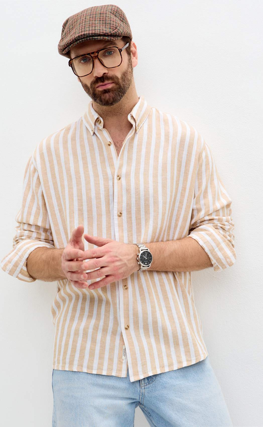 Рубашка д/р лен F611-0483 beige stripes