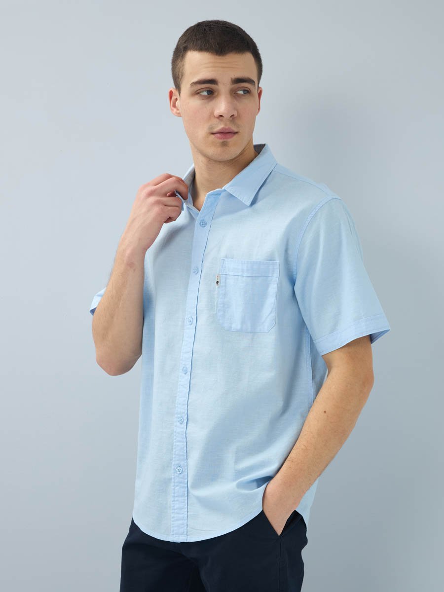 Рубашка изготовлена из высококачественной смесовой ткани (лен с хлопком), мягкая и приятная на ощупь.