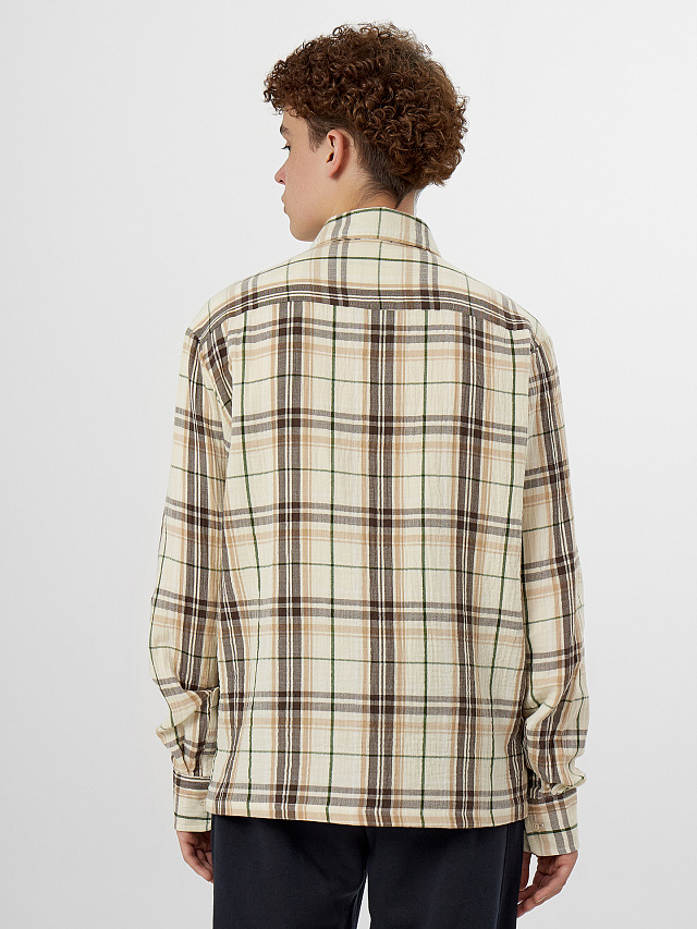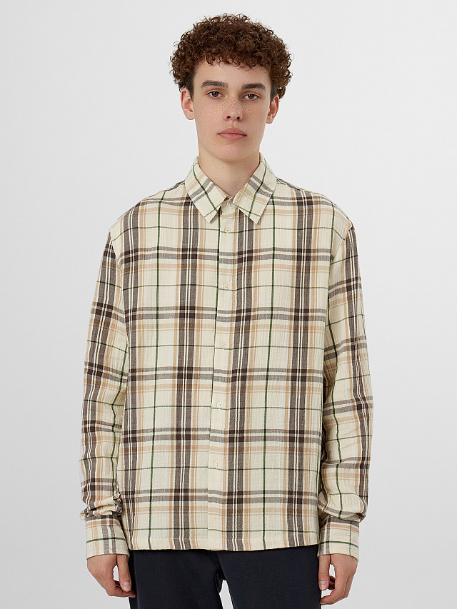 Отложной воротник и застежка на пуговицах позволяют легко варьировать степень формальности образа. Рубашка мужская с длинным рукавом дополнена манжетами с пуговицами – эта деталь добавляет образу аккуратности и завершенности. Универсальный бежевый цвет в сочетании с клеткой делает модель идеальной для создания как деловых, так и casual-комплектов.