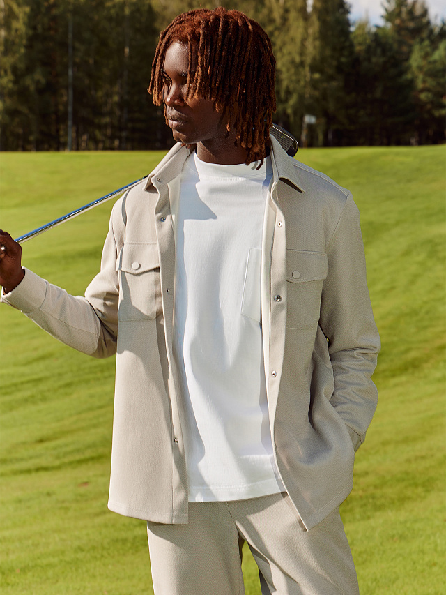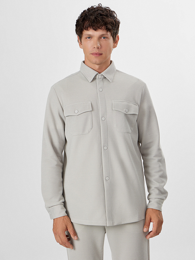 Мужская рубашка из трикотажного интерлока в стиле жакета — это удобная и стильная вещь, идеально подходящая для повседневной носки. Свободный силуэт придает образу расслабленность и не стесняет движения, а плотный и мягкий материал обеспечивает комфорт и практичность. Горловина оформлена рубашечным воротником, который добавляет строгости и завершенности. Застежка на кнопках по центру делает модель современной и удобной в использовании. Спереди расположены накладные карманы, создающие акцент и усиливающие практичность. Спущенная линия плеча подчеркивает стильную неформальность кроя, а длинные рукава с манжетами на кнопках вносят легкий элемент делового стиля. Нижний край изделия аккуратно обработан швом вподгибку, что добавляет аккуратности. Такое сочетание деталей делает рубашку универсальной — ее можно носить как самостоятельно, так и поверх футболки или водолазки.