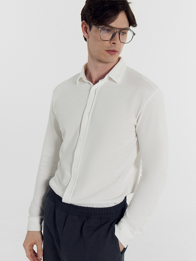 Рубашка мужская изготовлена из трикотажного полотна пике. Модель полуприлегающего силуэта, длиной до середины бедер. Плечевые швы смещены в сторону переда. Рукава втачные длинные, с отрезными манжетами на застежке на петлю и пуговицу. Горловина округлой формы с рубашечным воротником. Спереди есть застежка на планке на петли и пуговицы. По спинке отрезная кокетка. Стильная лаконичная рубашка (сорочка) мужская, которая идеально впишется в офисные аутфиты, подойдет для деловых и casual образов. Дополнить можно джинсами или брюками на свой вкус. Широкий размерный ряд. Рекомендуем!