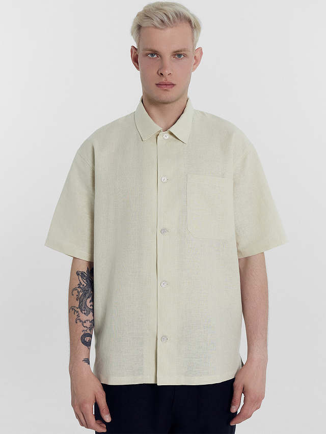 Стильная рубашка мужская прямого силуэта. Модель выполнена из премиального льна и натурального хлопка, длиной до середины бедер. Рукава короткие. Спереди - застежка на петли и пуговицы. Воротник-стойка, спинка с горизонтальной двойной кокеткой. Модная и комфортная рубашка — лучший выбор для жаркого лета. Вы можете носить ее как самостоятельный предмет гардероба, так и поверх футболок или маек. Широкий размерный ряд. Рекомендуем для лаконичных городских образов!
