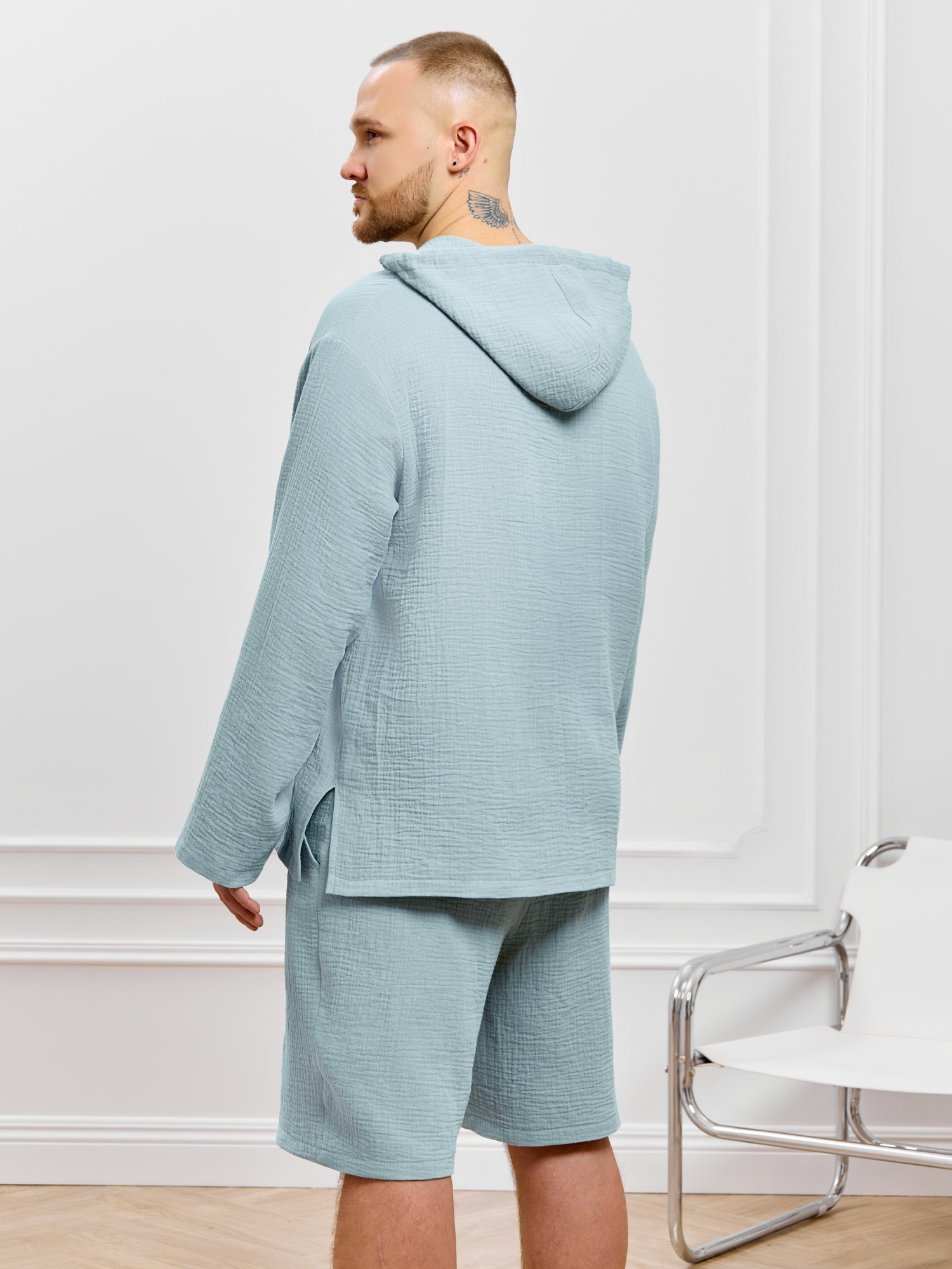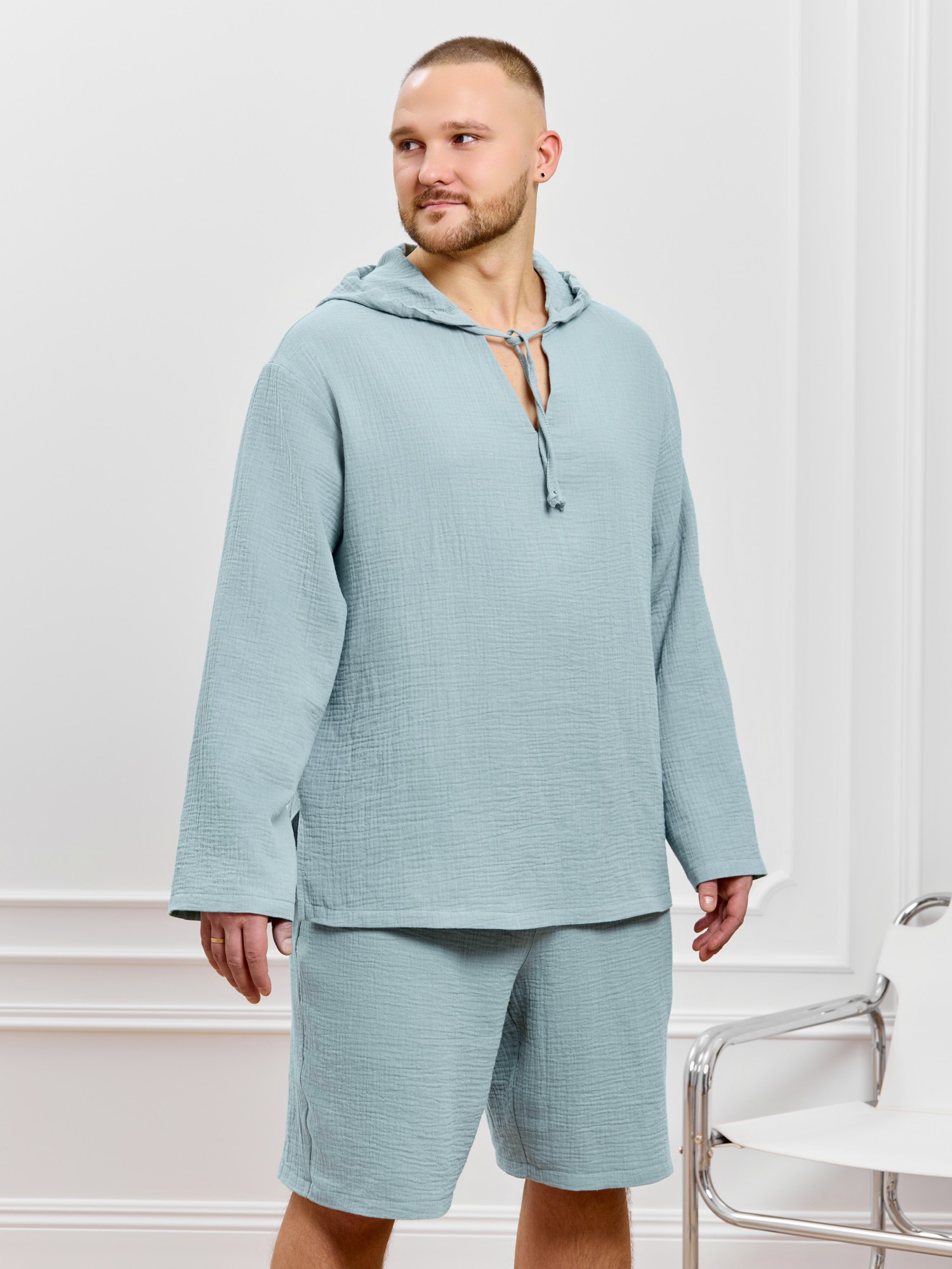 Костюм мужской из фактурного гладкокрашеного полотна, состоящий их джемпера и брюк. Джемпер - с капюшоном, длинными втачными рукавами и V-образным вырезом горловины спереди. В шве подгибки переднего края капюшона вставлен шнурок из основного материала. Нижние срезы рукавов и низ изделия обработаны подгибкой. Шорты - классическогь покроя, на притачном поясе с эластичной тесьмой внутри, с карманами в боковых швах. Нижние срезы обработаны подгибкой.