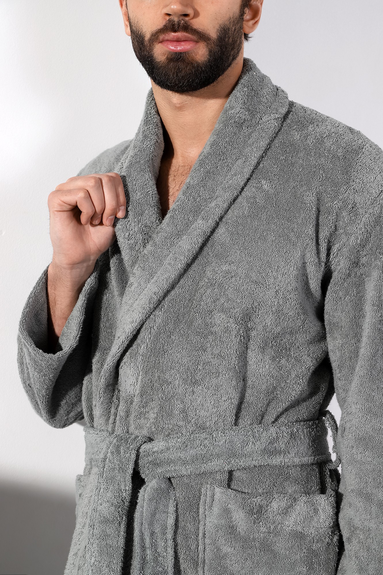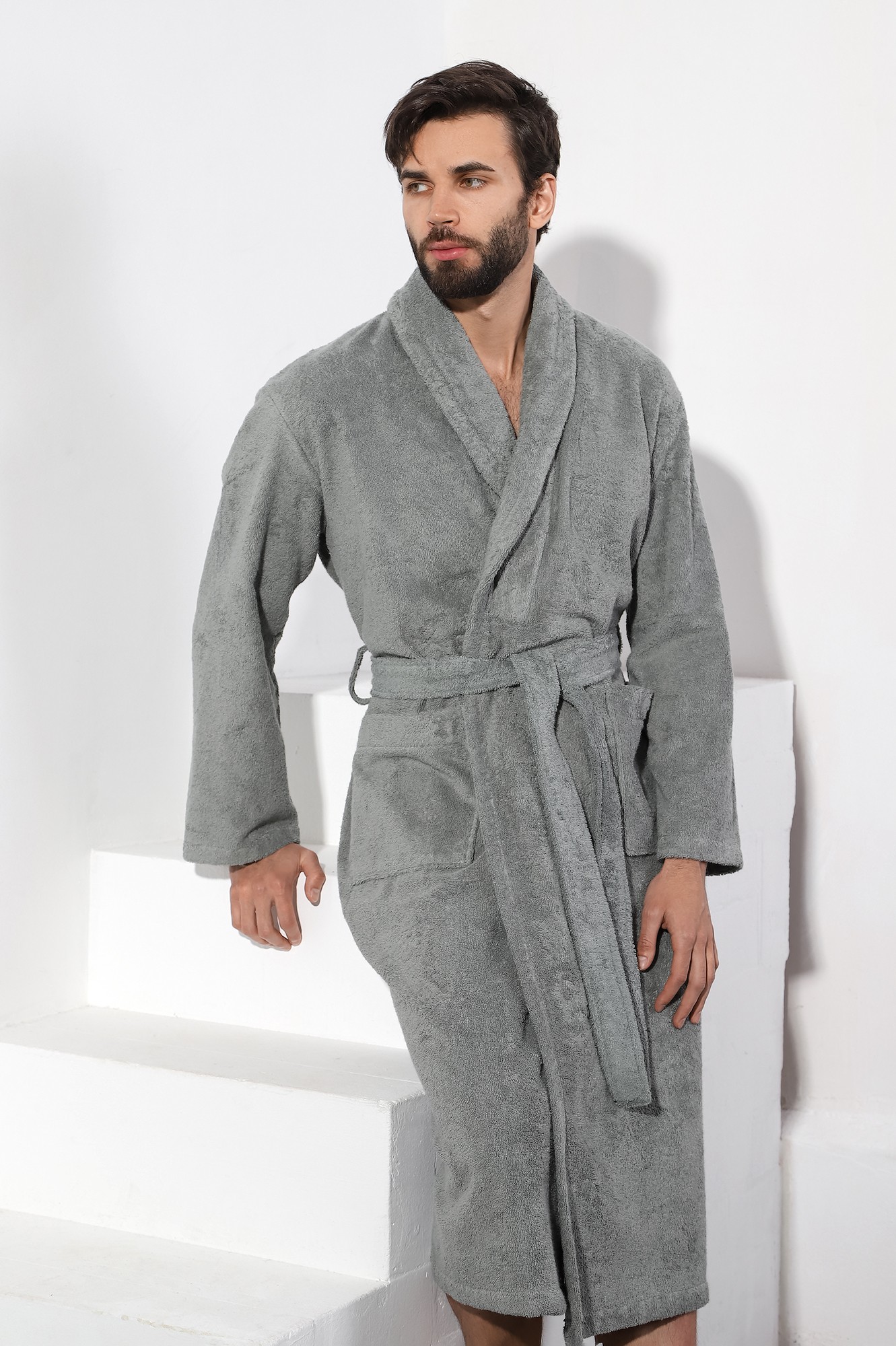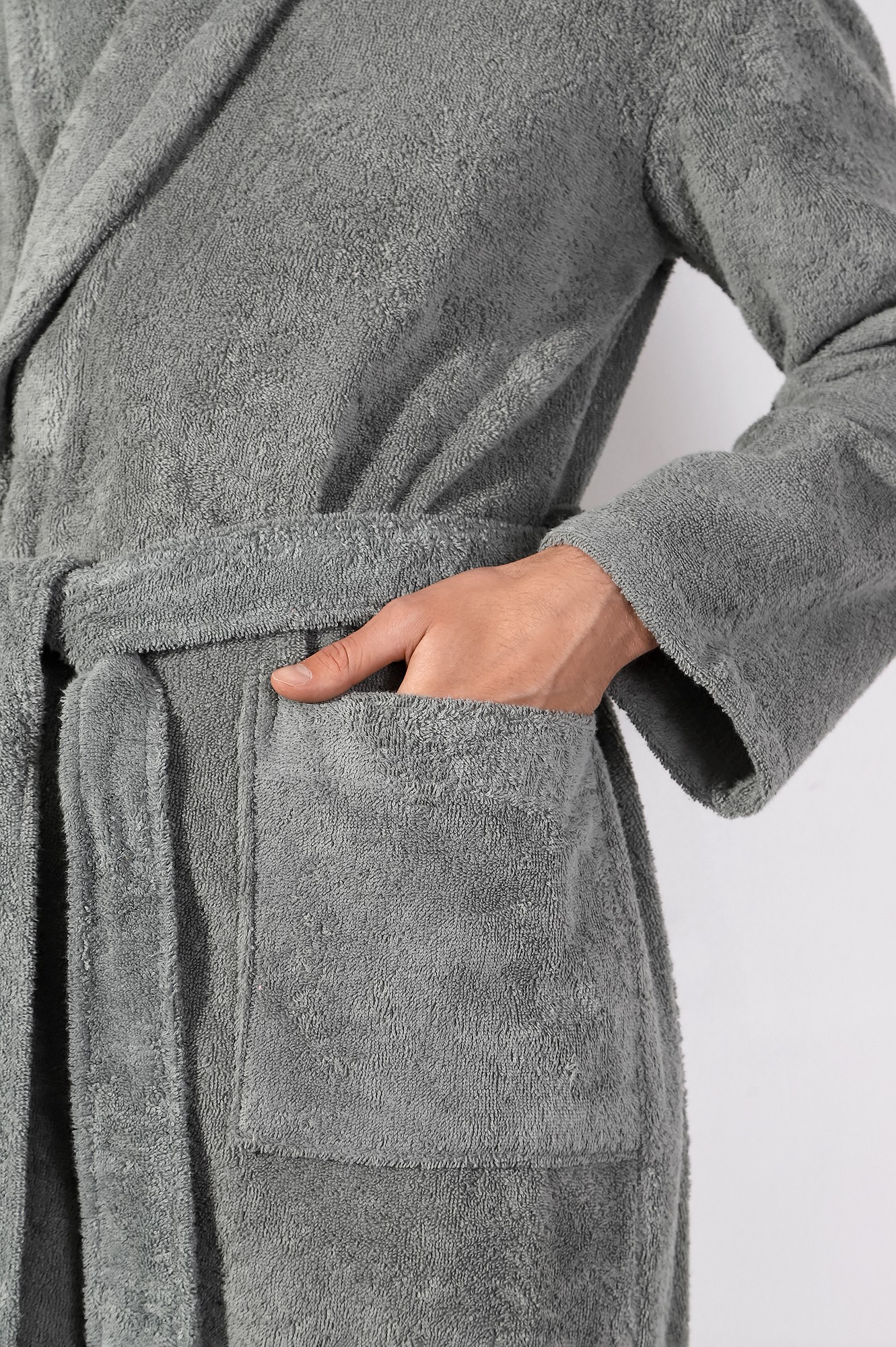 Мужской халат из двустороннего махрового хлопкового полотна. Модель на запах, с поясом в шлёвках, с боковыми карманами, с воротником "шаль", с петлей-вешалкой по горловине спинки.