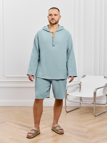 Костюм мужской из фактурного гладкокрашеного полотна, состоящий их джемпера и брюк. Джемпер - с капюшоном, длинными втачными рукавами и V-образным вырезом горловины спереди. В шве подгибки переднего края капюшона вставлен шнурок из основного материала. Нижние срезы рукавов и низ изделия обработаны подгибкой. Шорты - классическогь покроя, на притачном поясе с эластичной тесьмой внутри, с карманами в боковых швах. Нижние срезы обработаны подгибкой.