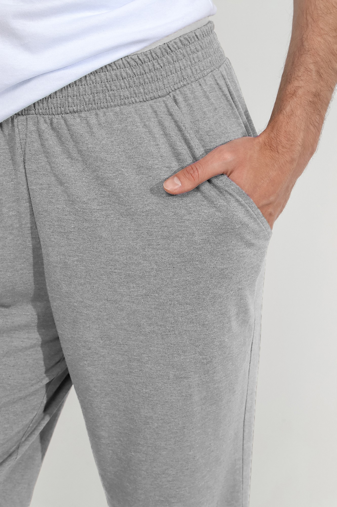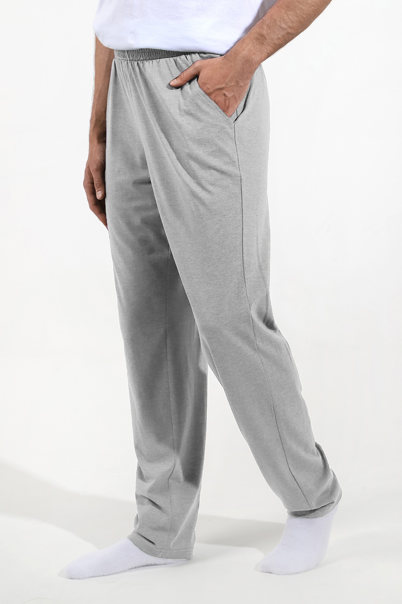 Брюки мужские из меланжированного трикотажного полотна "кулирка", прямого силуэта, с карманами в боковых швах, на притачном поясе с эластичной тесьмой внутри. В центре пояса - две обметанные петли , через которые продет шнурок для регулирования степени прилегания шорт по талии.