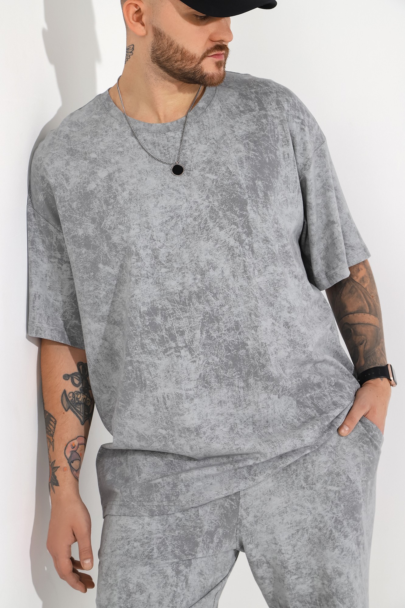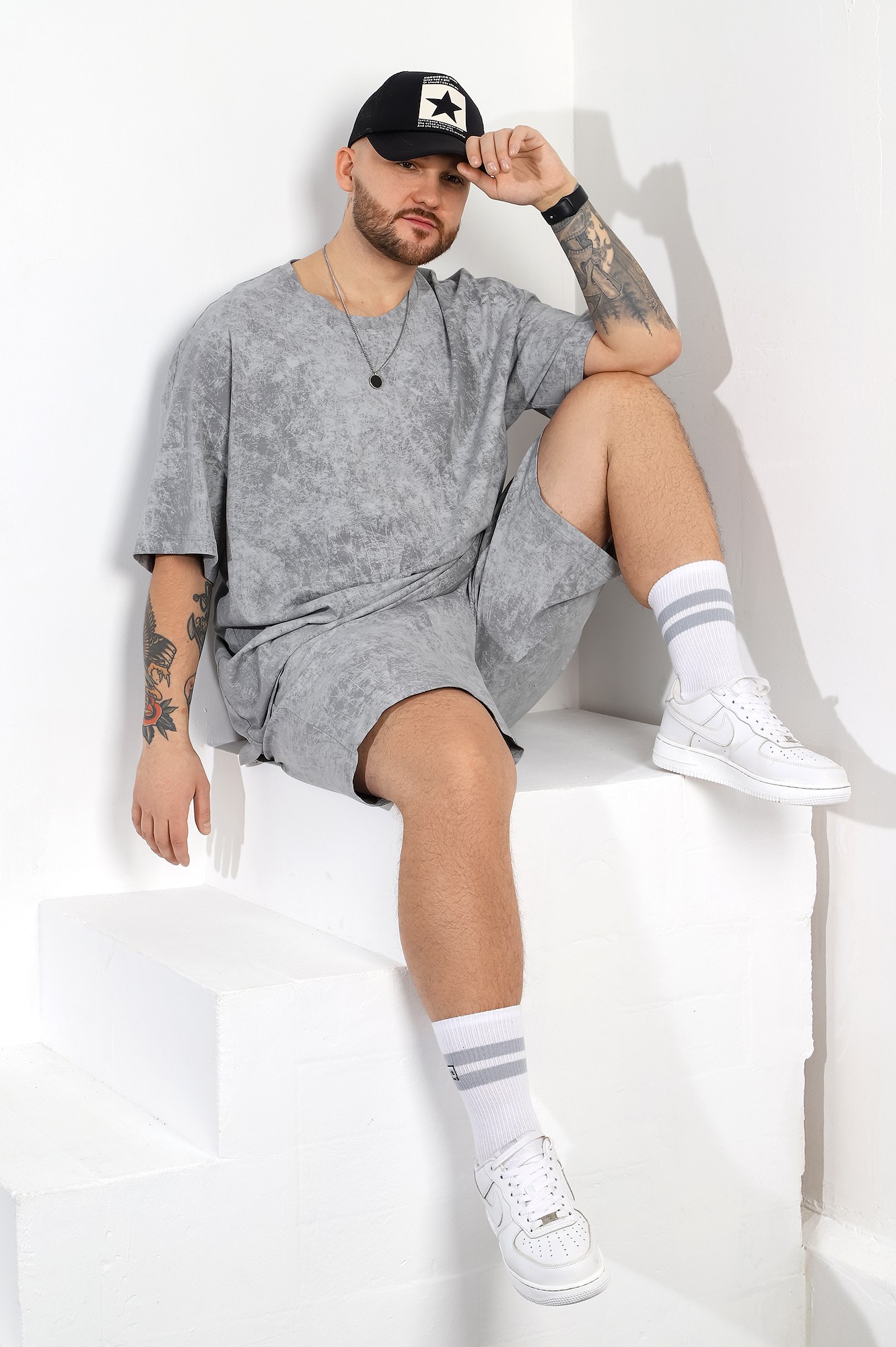 Костюм мужской, состоящий из футболки и шорт. Футболка - свободного покроя, короткими втачными рукавами и горловиной овальной формы, обработанной втачной планкой. По шву втачивания планки настрочена двойная отделочная строчка. Шорты - удлиненные, с карманами в боковых швах, на притачном поясе с эластичной тесьмой внутри.