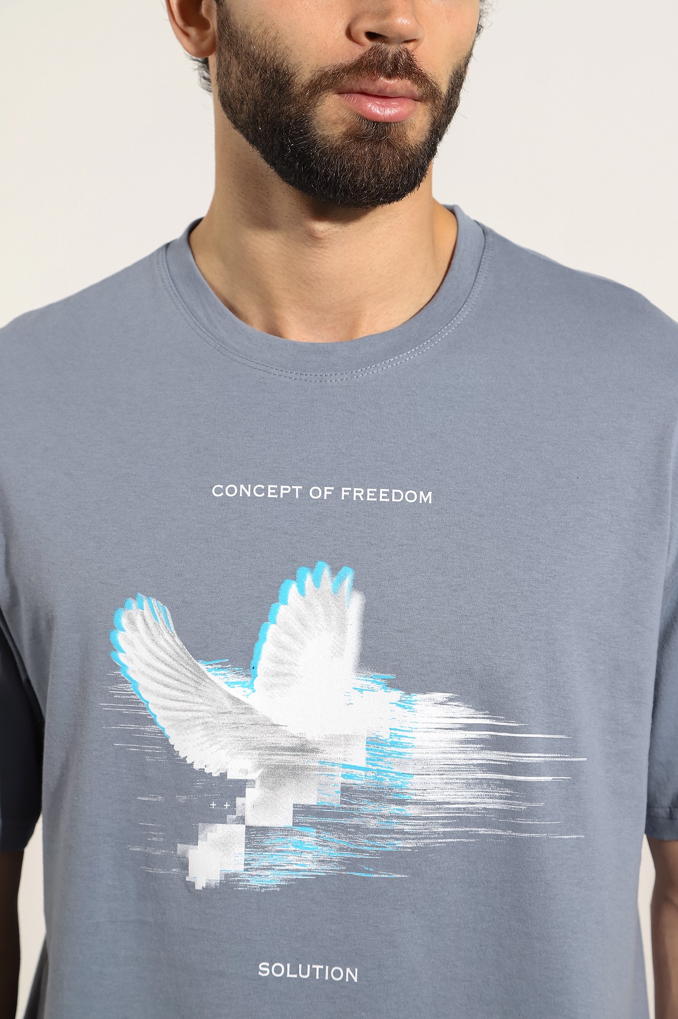 Футболка мужская из гладкокрашеного трикотажного полотна "кулирка", свободного покроя, со спущенным плечом и втачными короткими рукавами. Горловина овальной формы обработана втачной планкой. По шву втачивания планки настрочена двойная отделочная строчка. В центре переда - принт, выплненный в технике шелкографии.