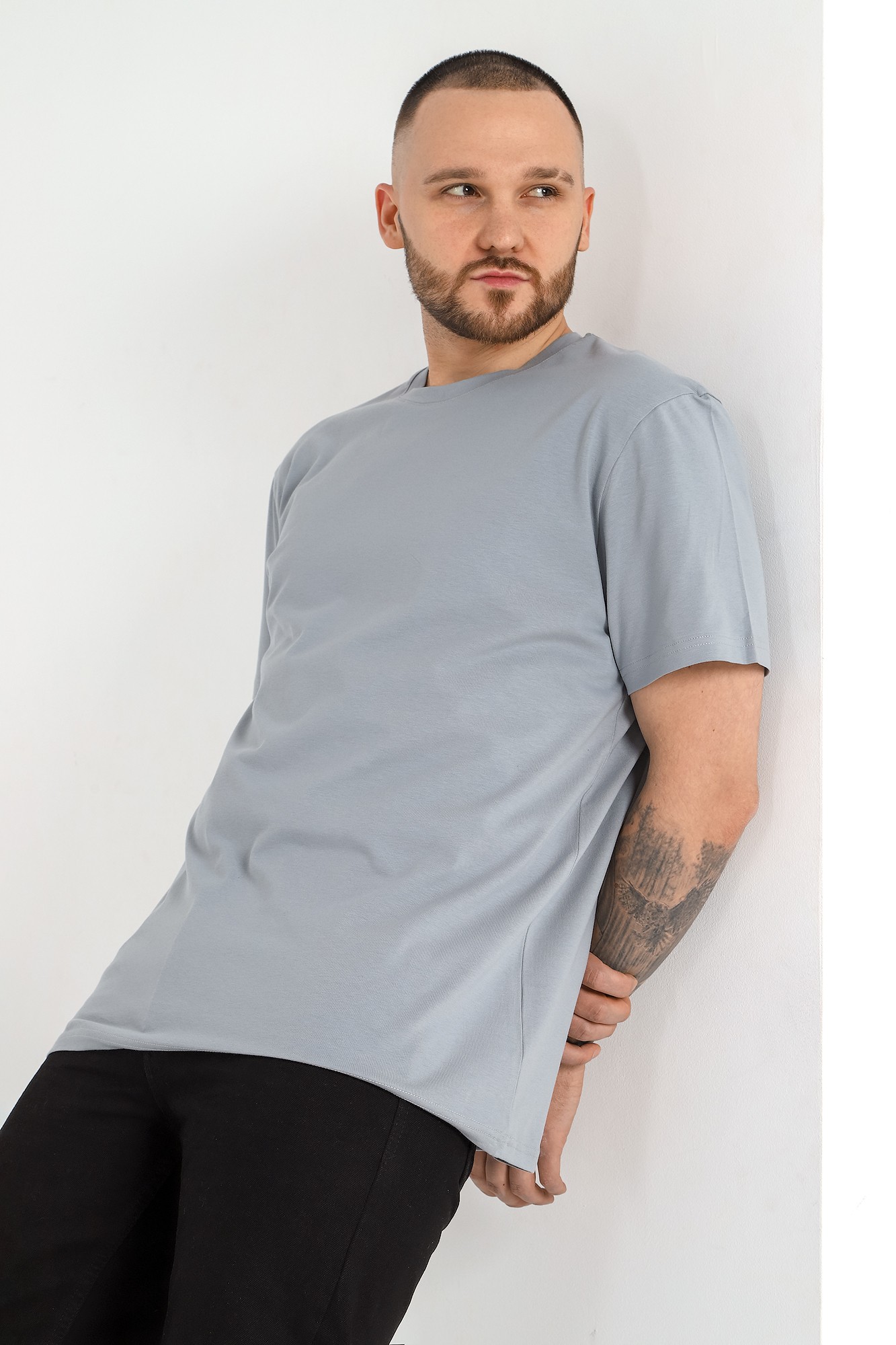 Базовая однотонная мужская футболка прямого силуэта без принта. Выполнена из трикотажного полотна: хлопкового с добавлением лайкры. Горловина округлой формы с усилителем горловины спинки.