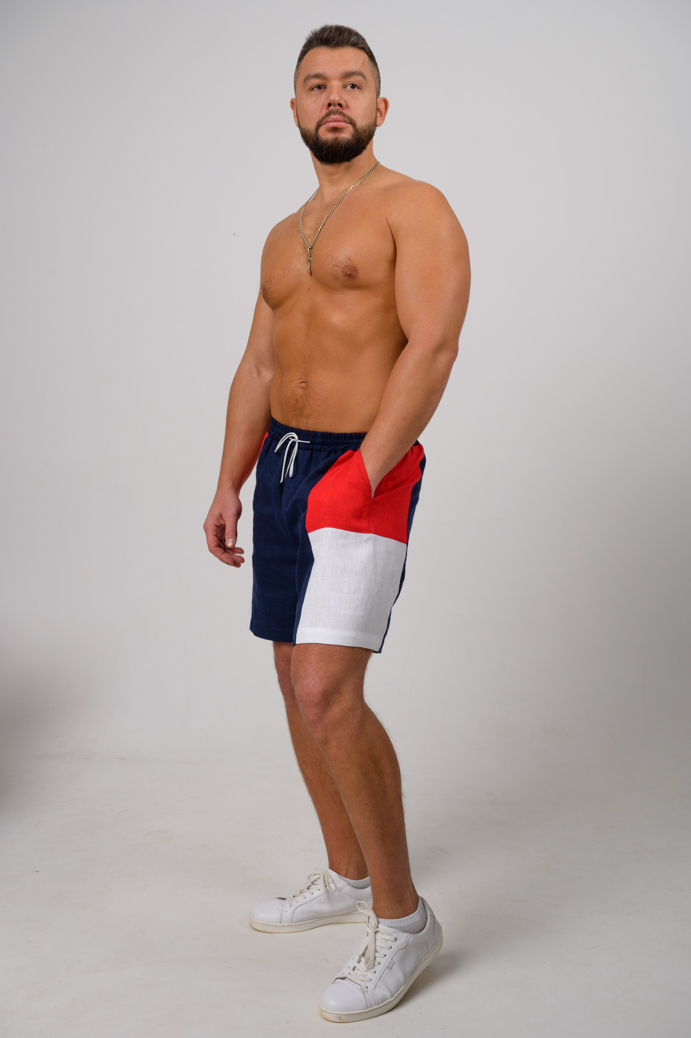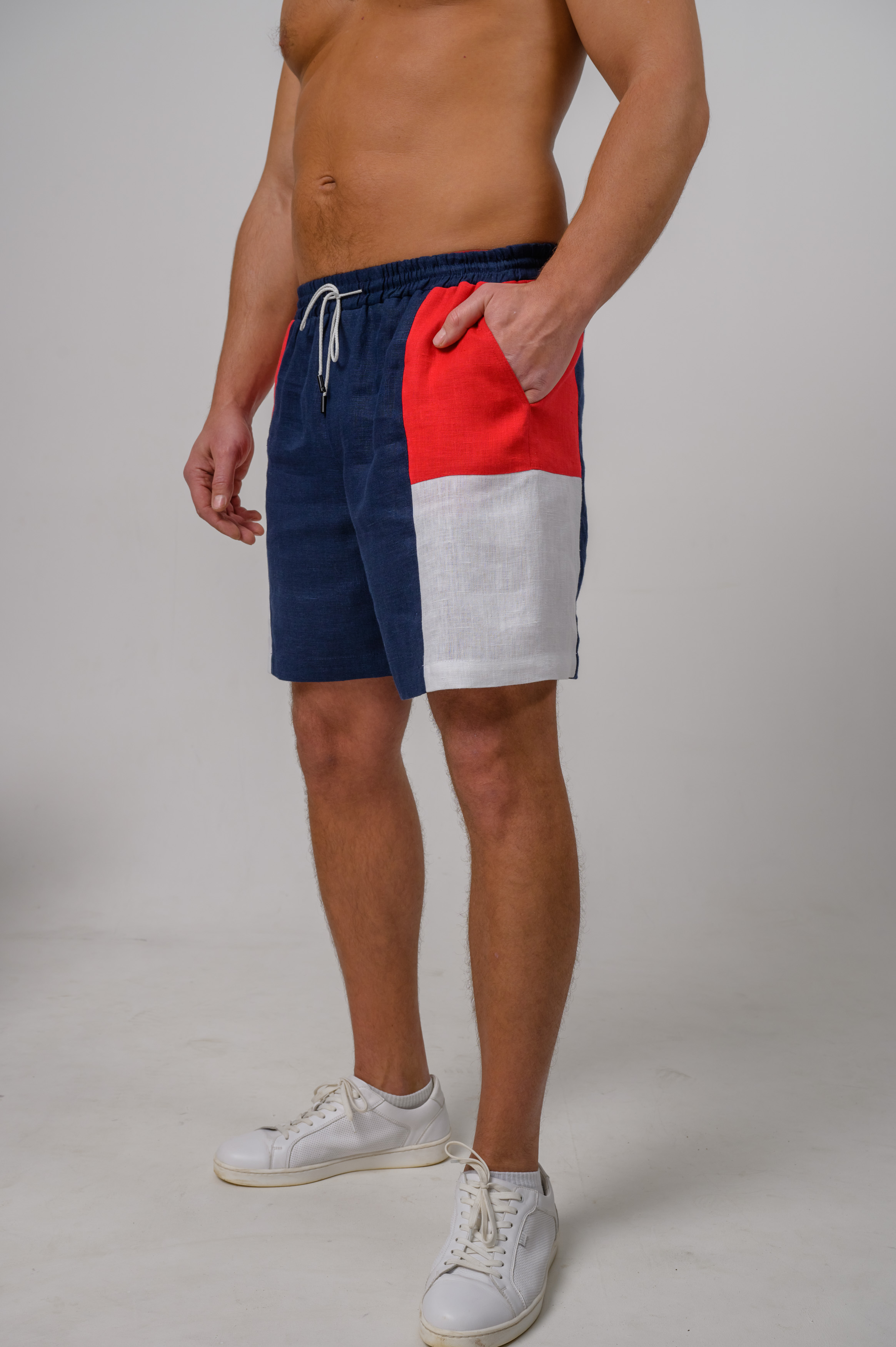 Летнее мужские льняные шорты на резинке. Модель выполнена из чистольняной ткани в сочетании контрастных цветов. Имеются 2 боковых кармана.