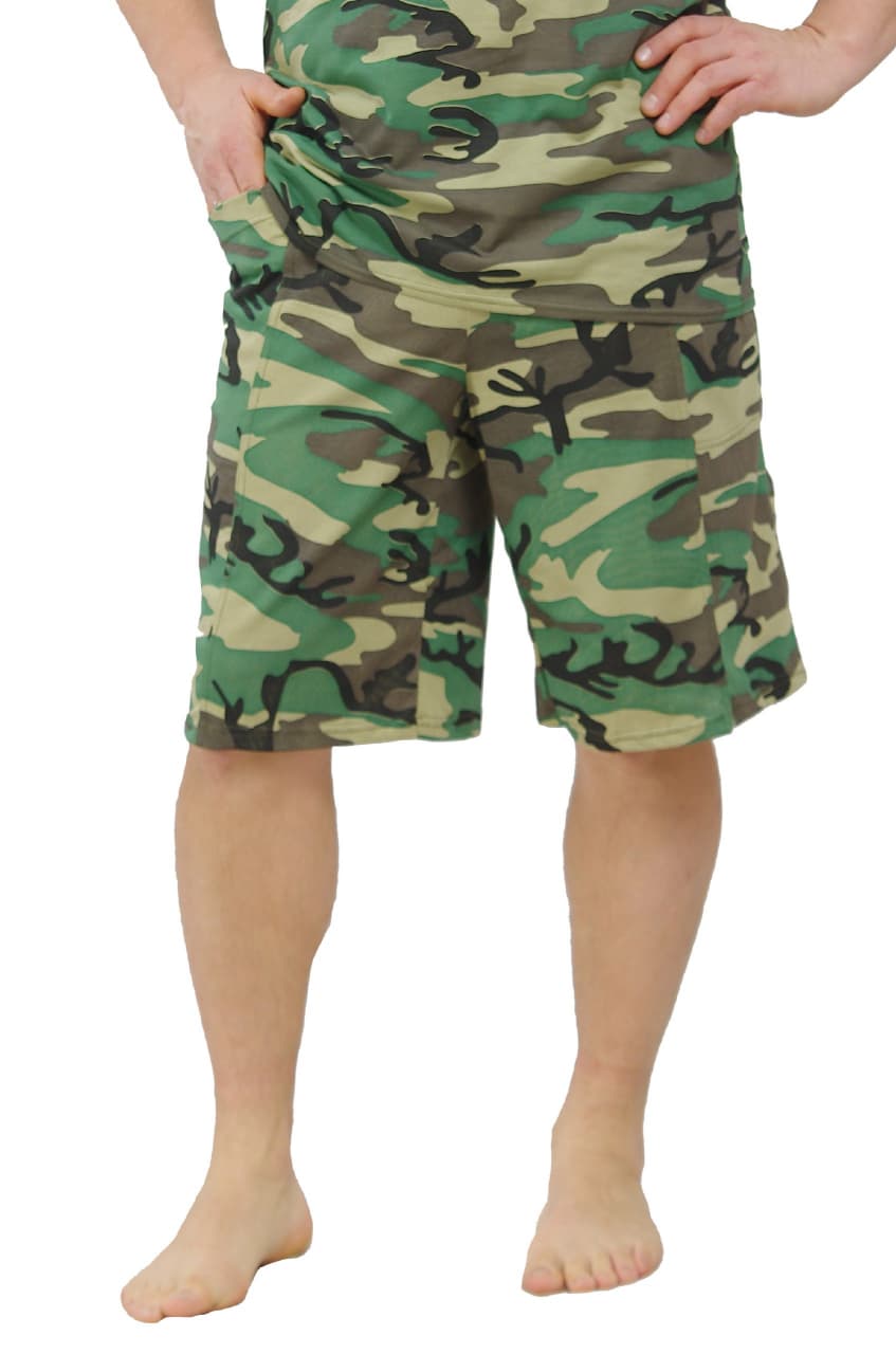 Отличные шорты из камуфлированного трикотажа с накладными карманами. Для производства изделия используется кулирное трикотажное полотно плотностью 150 г/м2.