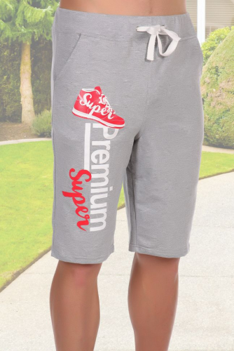 Мужские шорты из футера с лайкрой. Принт в виде кроссовка и надписи, пояс на резинке со шнурком, по бокам карманы, длина приблизительно до коленей.