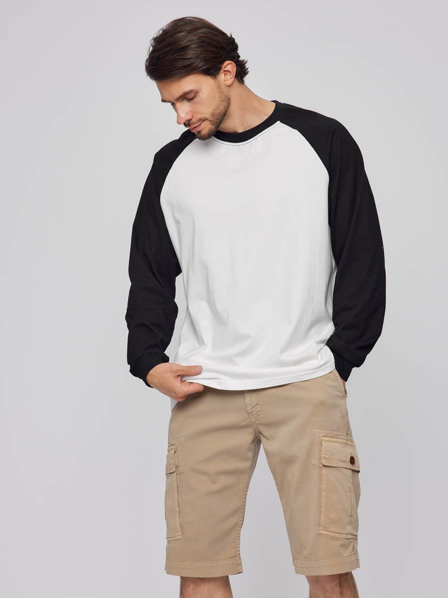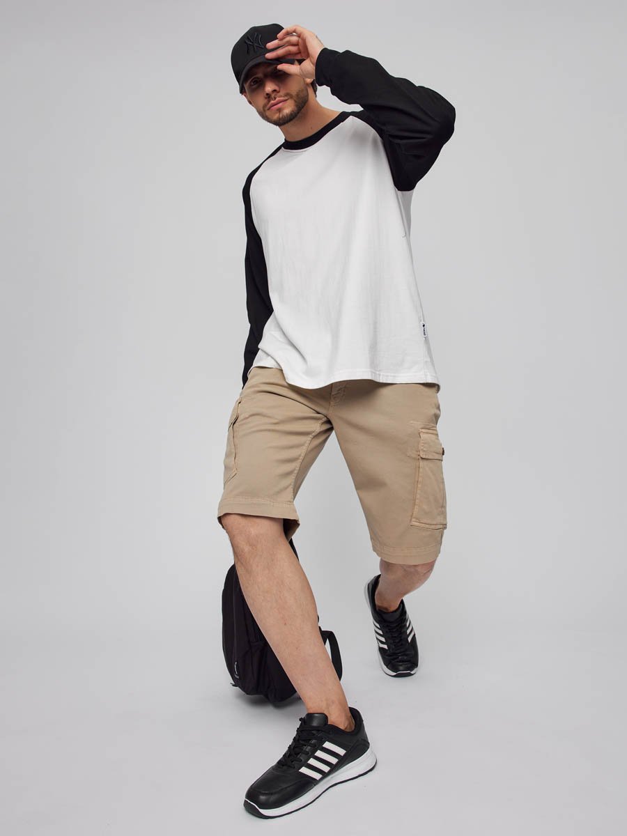 Мужские шорты-карго. Посадка Comfort fit (свободные по бедру), средняя посадка по талии спереди и высокая сзади, прямые к низу. Застежка на молнии. Шорты имеют боковые косые карманы, по бокам накладные карманы с клапаном застегивающиеся на  пуговицу, сзади имитация  прорезных карманов. Выполнены из слабоэластичной плотной ткани gabardine stretch. Крашение Garment dayed, т.е. покрашены в готовом виде после пошива.