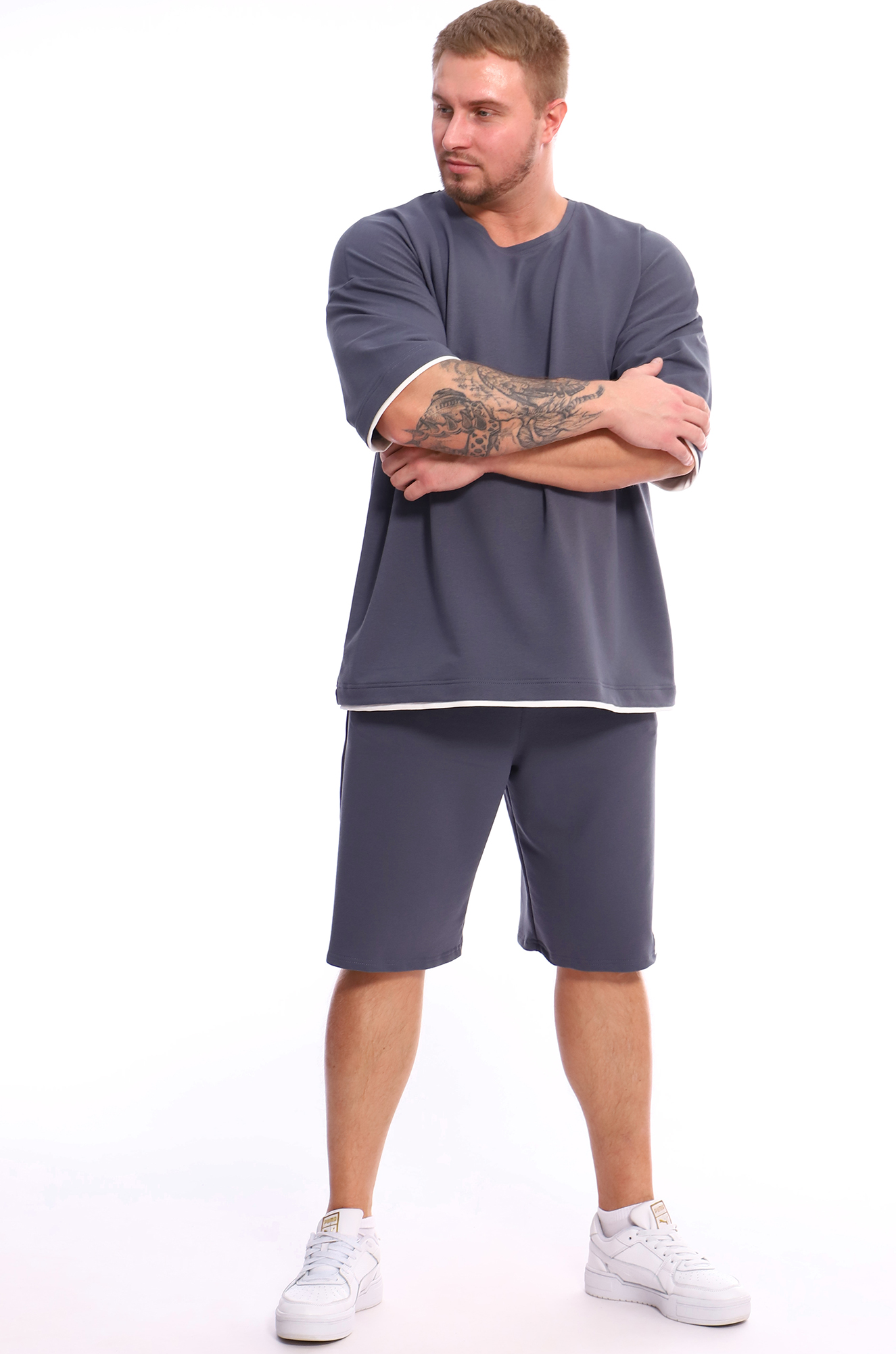 Мужские удлинённые шорты с удобными боковыми карманами, пояс на широкой резинке. Модель свободного кроя, комфортной длины. Ткань футер двухнитка с добавлением лайкры.