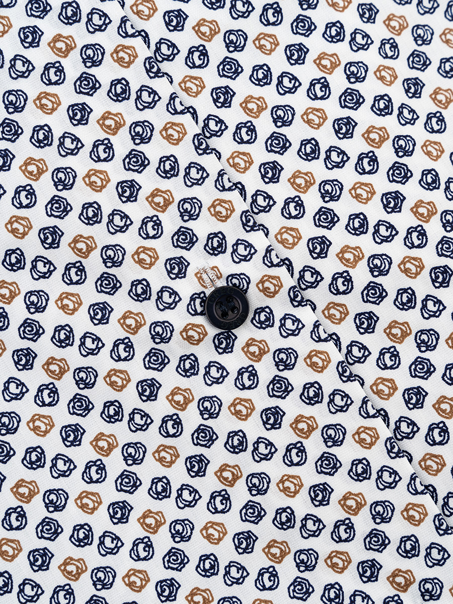 Цвет: Белый Рисунок: В мелкие эле..показатьменты Состав: 70% хлопок 30% полиэстер Модель: Зауженная Ворот: Немецкий мягкий Караман: отсутствует Силуэт: Полуприталенный силуэт / Regular fit Отделка: Сорочки- внутренняя стойка воротника из ткани компаньонаменты