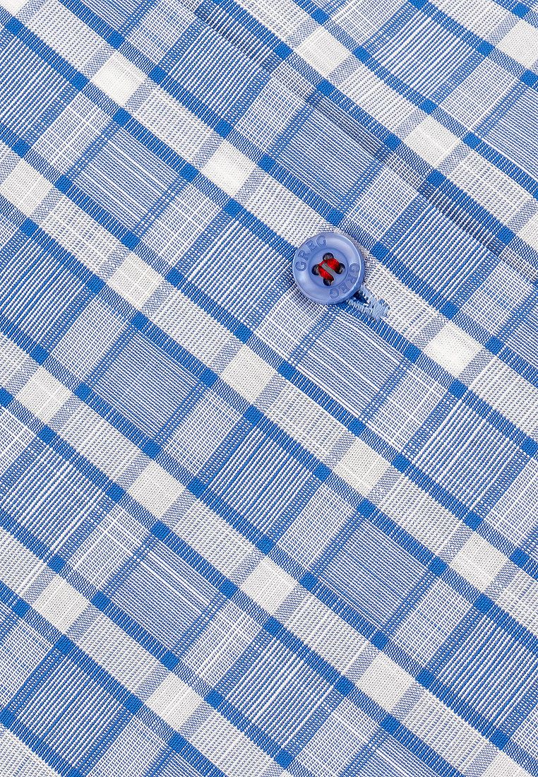 Цвет: Голубой Рисунок: Клетка..показать> Состав: 100% хлопок Easy Care Модель: Зауженная Ворот: Французский маленький Караман: стандартный, слева, накладной Силуэт: Полуприталенный силуэт / Regular fit Отделка: Сорочки- внутренняя стойка воротника из ткани компаньона>