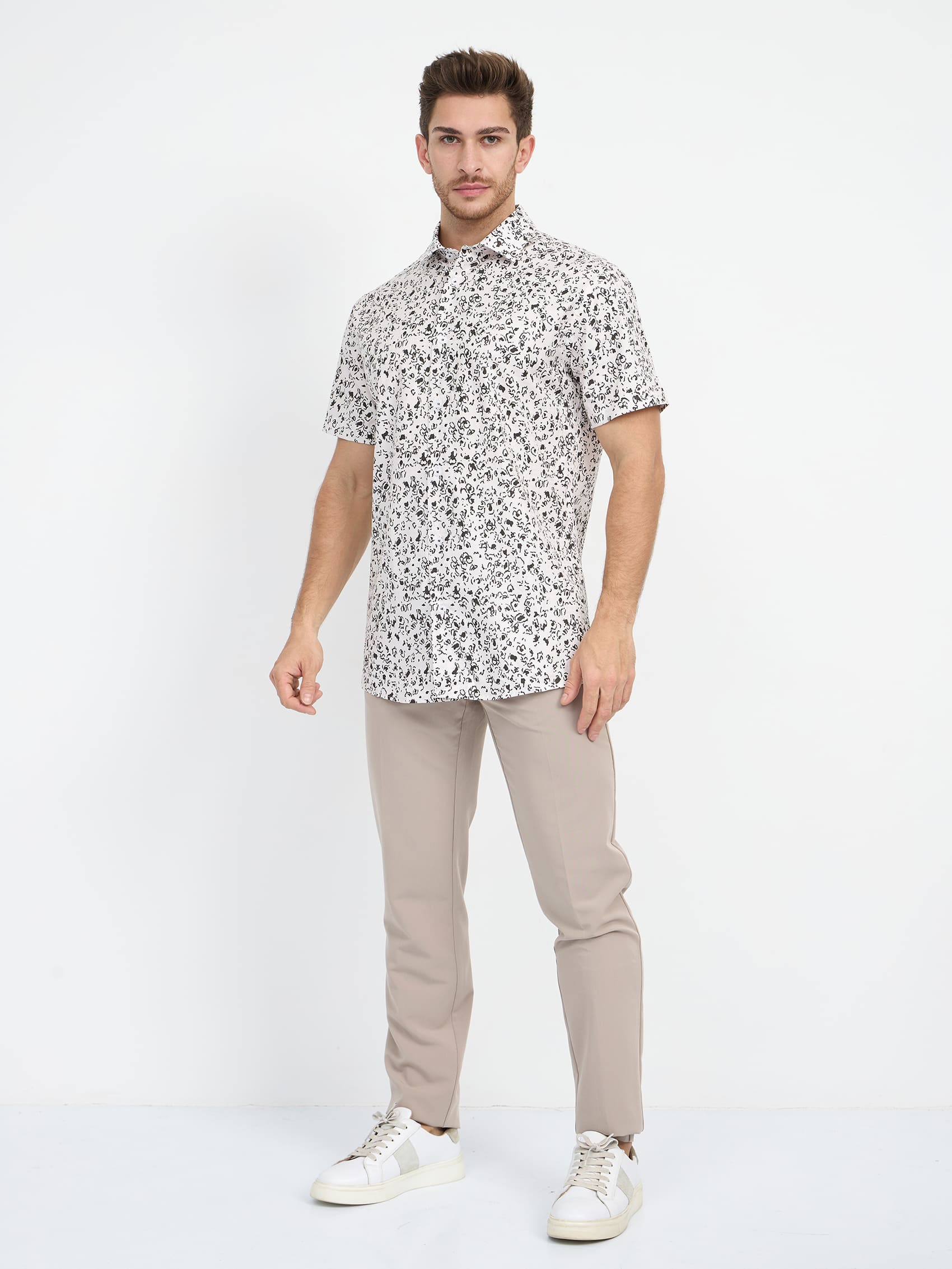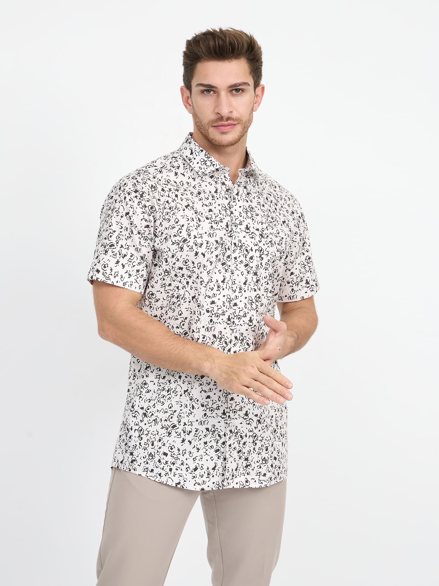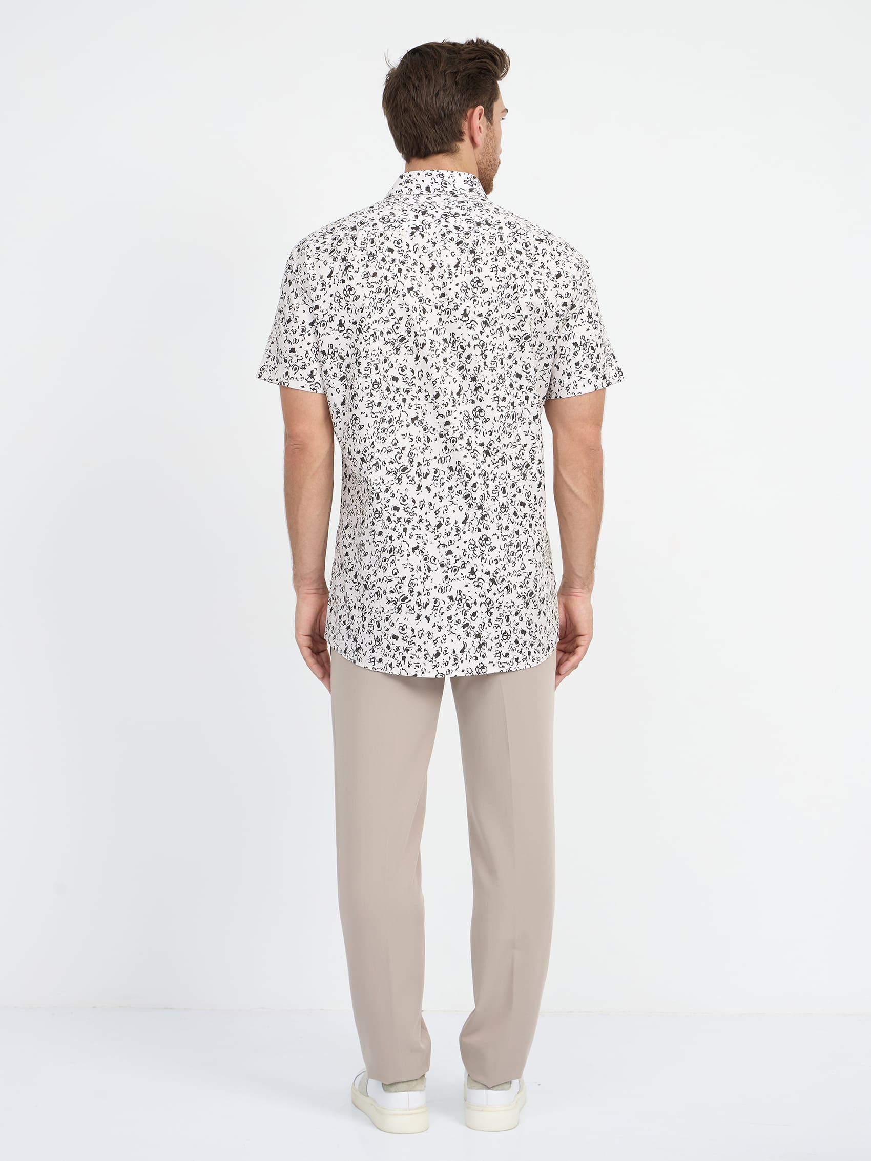 Цвет: Белый Рисунок: В крупные эл..показатьементы Состав: 100% хлопок Easy Care Модель: Зауженная Ворот: Немецкий Караман: отсутствует Силуэт: Полуприталенный силуэт / Regular fit Отделка: Сорочки- тесьма по нижнему краю внутренней стойки воротникаементы