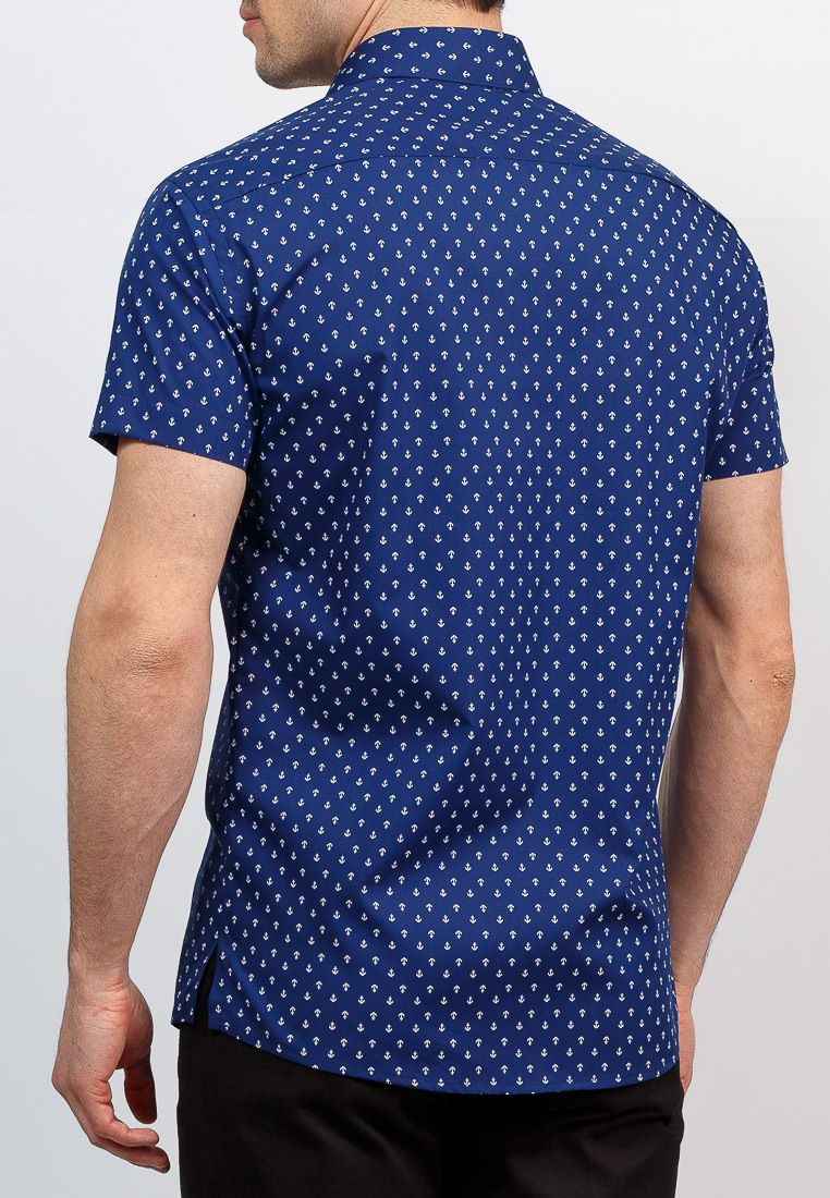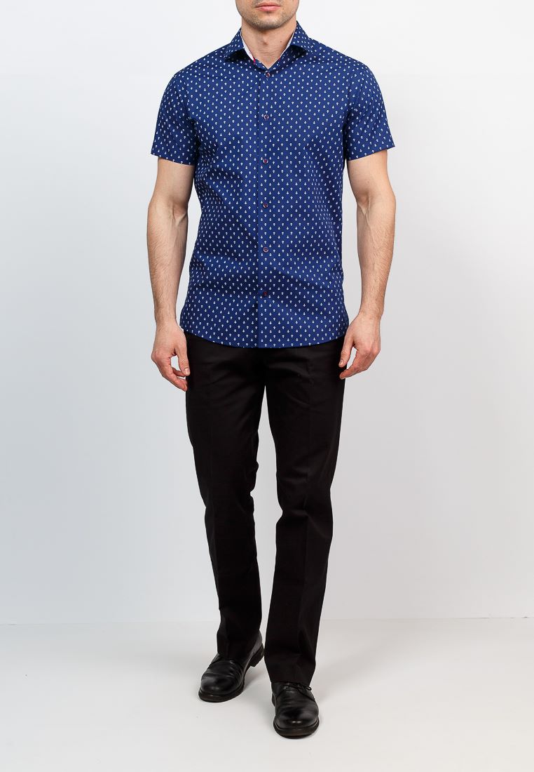 Цвет: Синий Рисунок: В мелкие эле..показатьменты Состав: 90% хлопок 10% полиэстер Модель: Зауженная навыпуск укороченная с разрезами по бокам Ворот: Французский маленький Караман: отсутствует Силуэт: Полуприталенный силуэт / Regular fit Отделка: Сорочки- внутренняя стойка воротника из ткани компаньона по косойменты