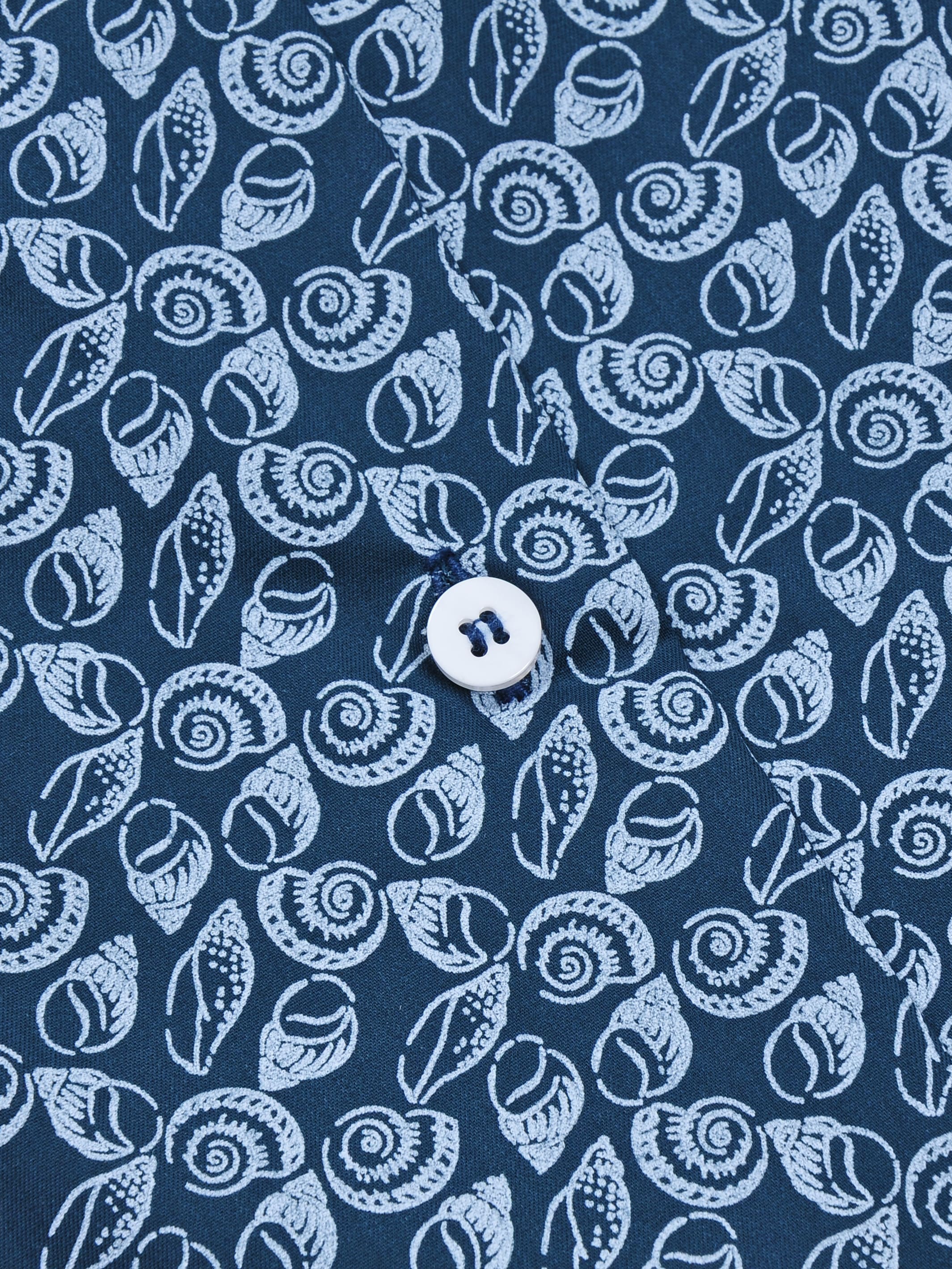 Цвет: Синий Рисунок: В крупные эл..показатьементы Состав: 70% бамбук 15% хлопок 15% полиэстер Модель: Зауженная навыпуск укороченная Ворот: Немецкий мягкий Караман: отсутствует Силуэт: Полуприталенный силуэт / Regular fit Отделка: Сорочки- тесьма по нижнему краю внутренней стойки воротникаементы