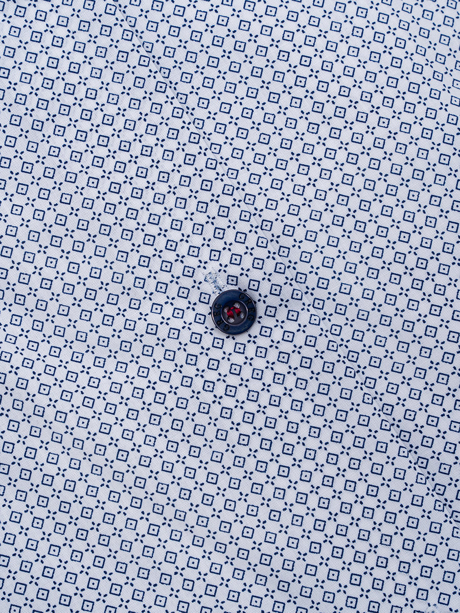 Цвет: Белый Рисунок: В мелкие эле..показатьменты Состав: 80% хлопок 20% полиэстер Модель: Зауженная Ворот: Немецкий Караман: отсутствует Силуэт: Полуприталенный силуэт / Regular fit Отделка: Сорочки- внутренняя стойка воротника из ткани компаньонаменты