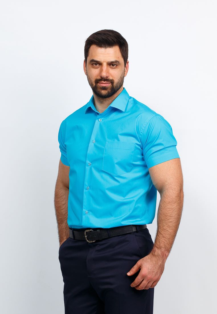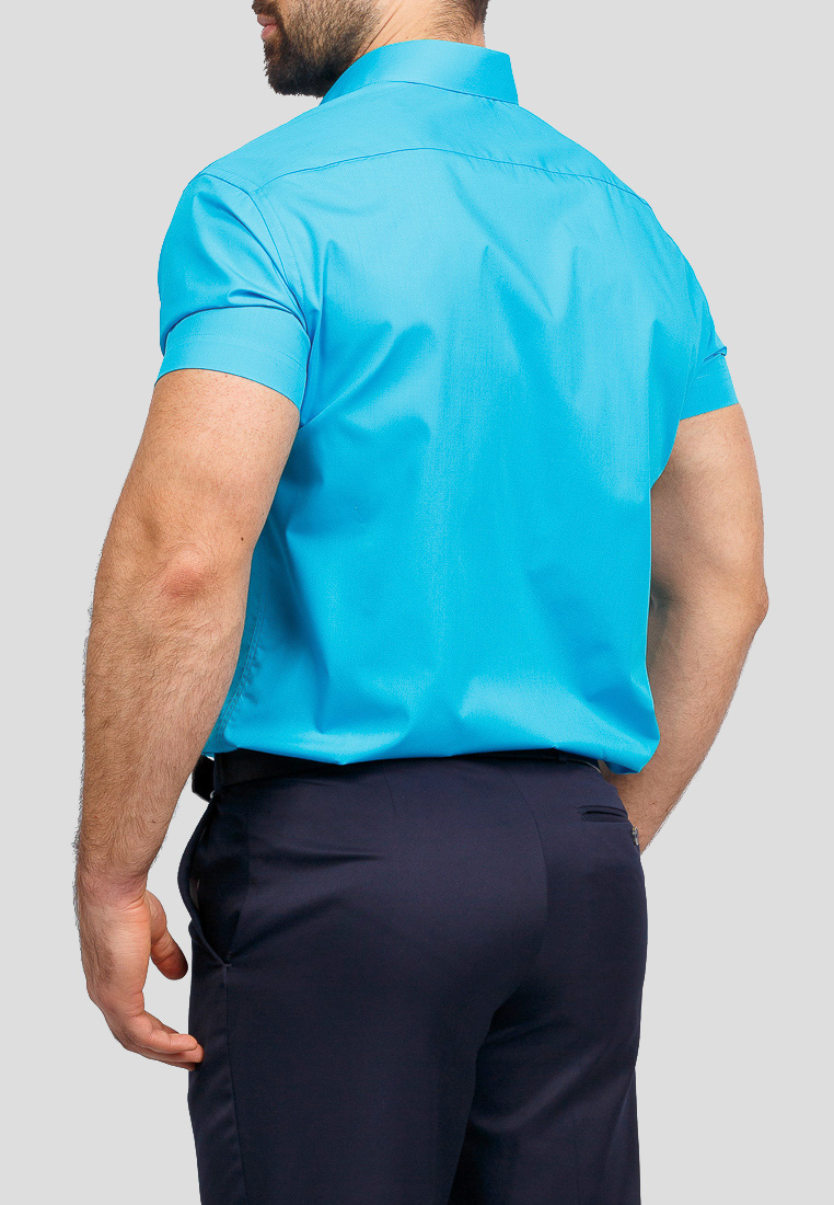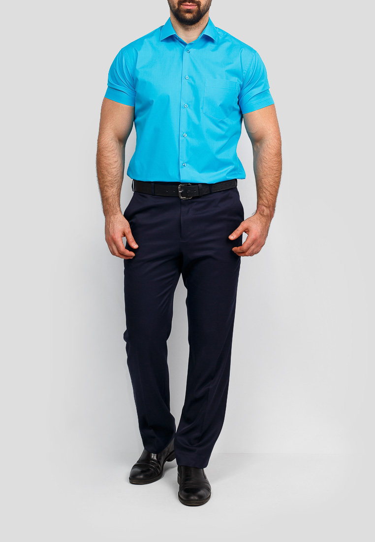 Цвет: Голубой Рисунок: Без рисунк..показатьа Состав: 90% хлопок 10% полиэстер Модель: Зауженная Ворот: Французский маленький Караман: стандартный, слева, накладной Силуэт: Полуприталенный силуэт / Regular fitа